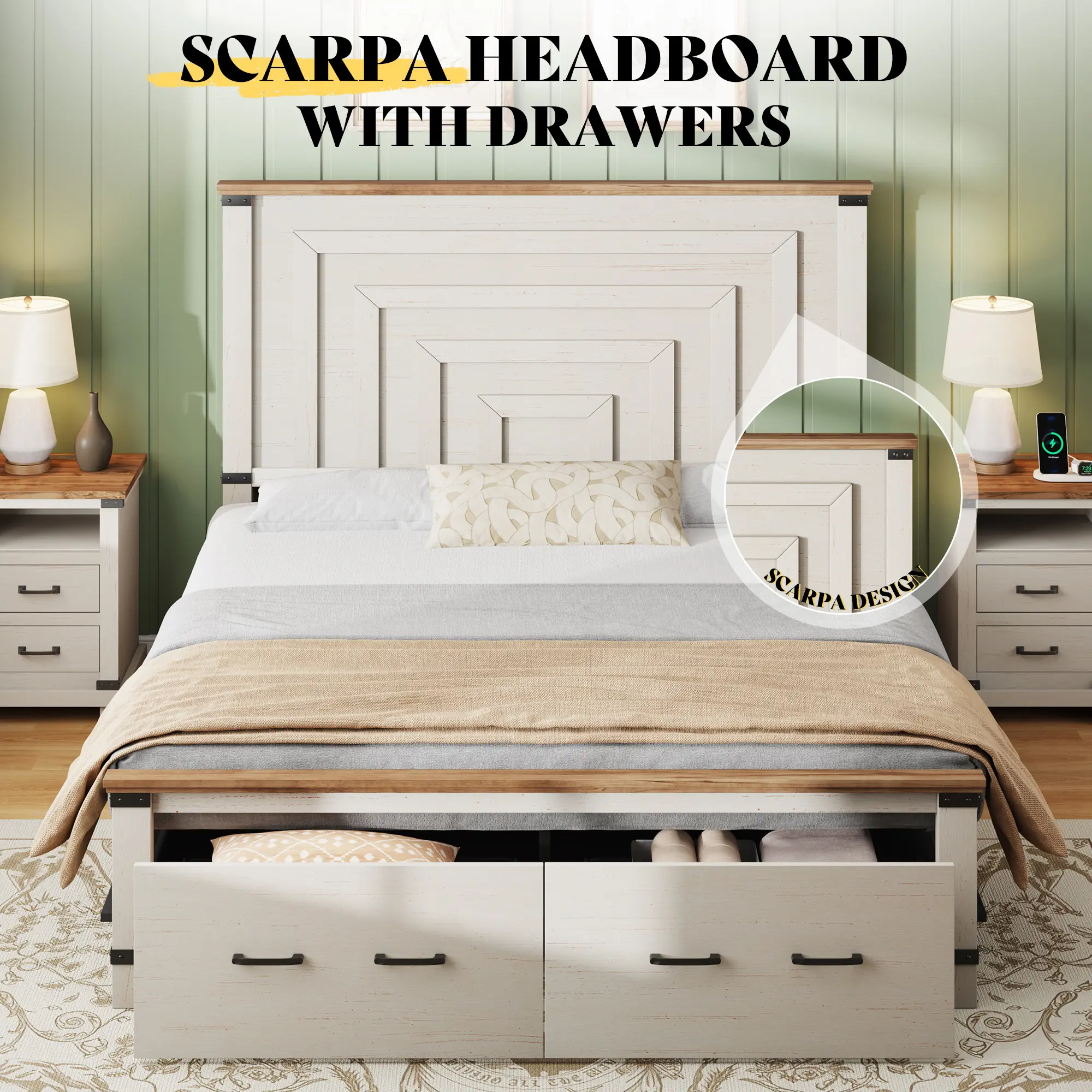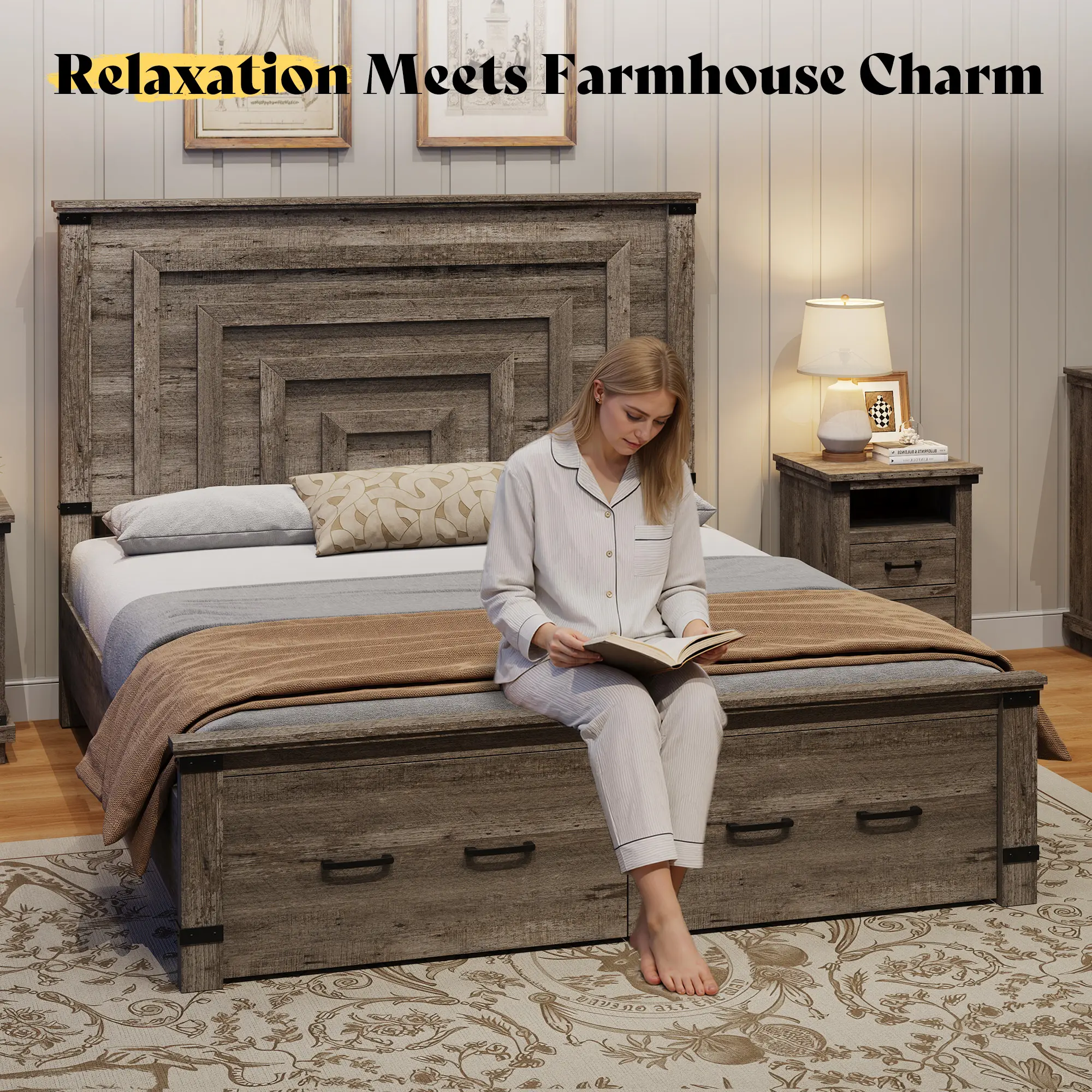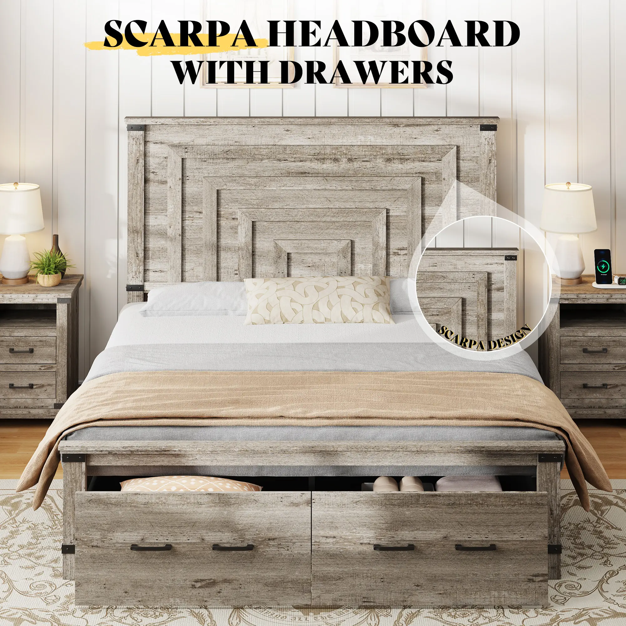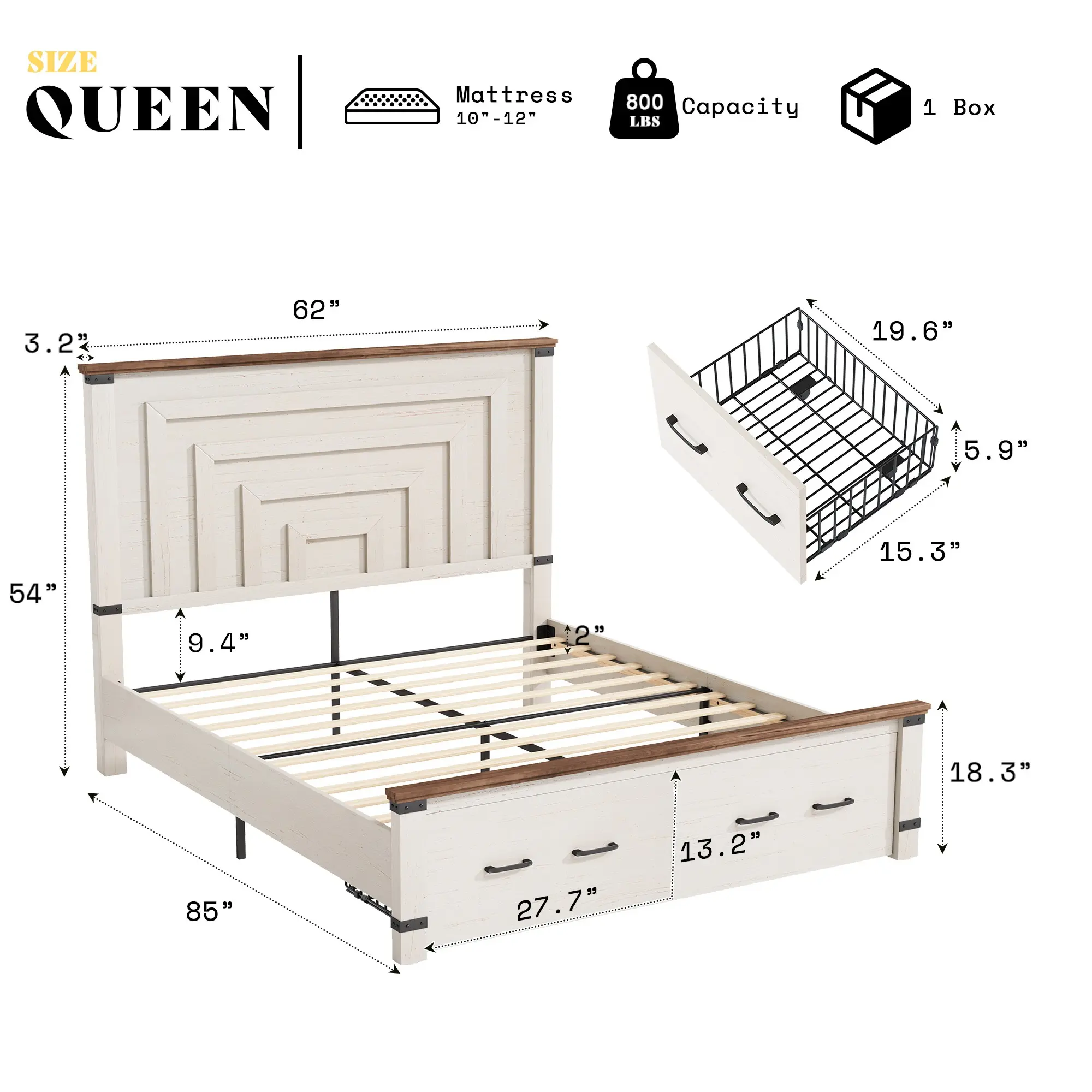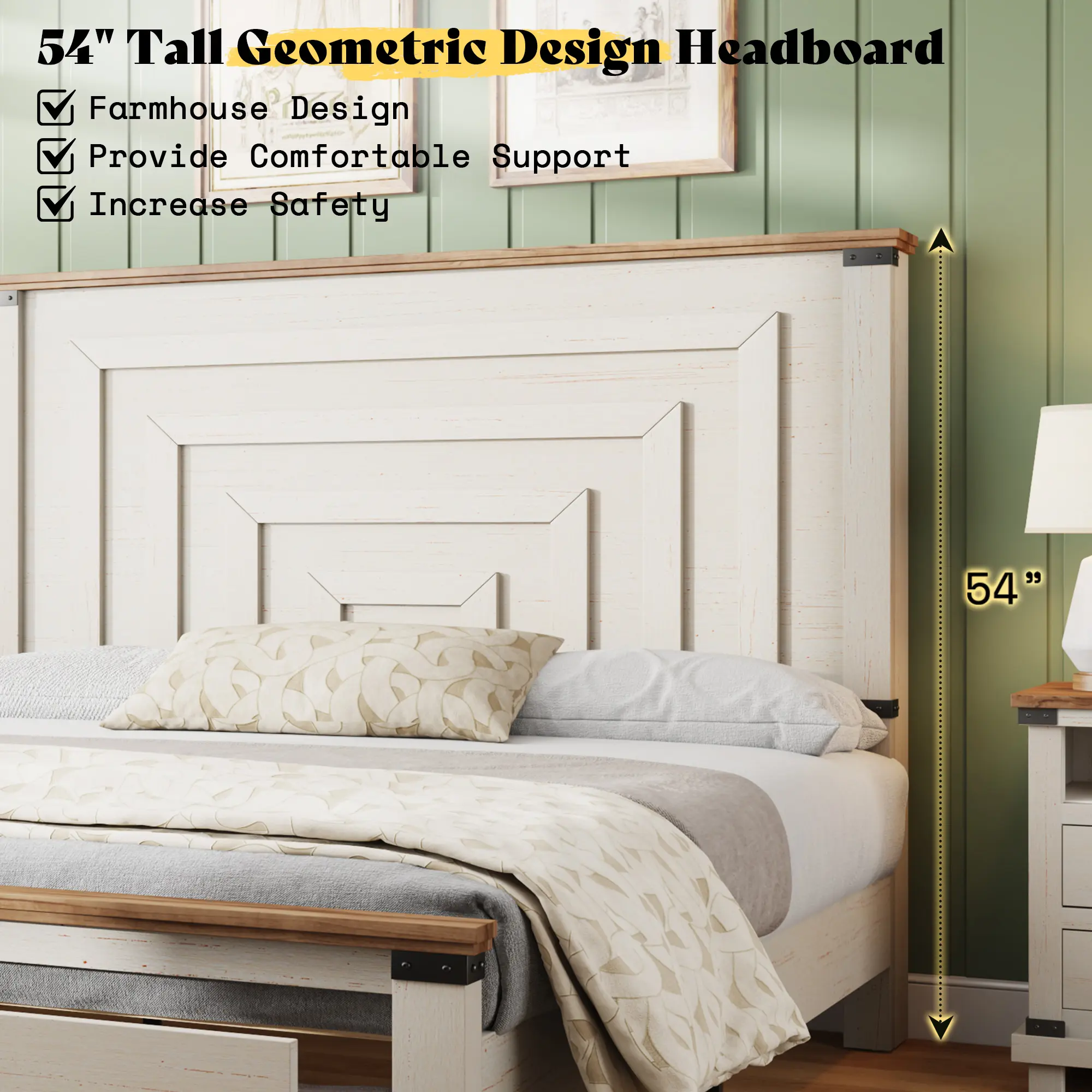 • Stylish & Functional: Elevate your bedroom with our farmhouse bed frame. Combining rustic charm with modern geometric design, the bed frame offers a 54” tall headboard for added comfort. Its spacious drawers provide hidden storage, perfect for keeping your room tidy