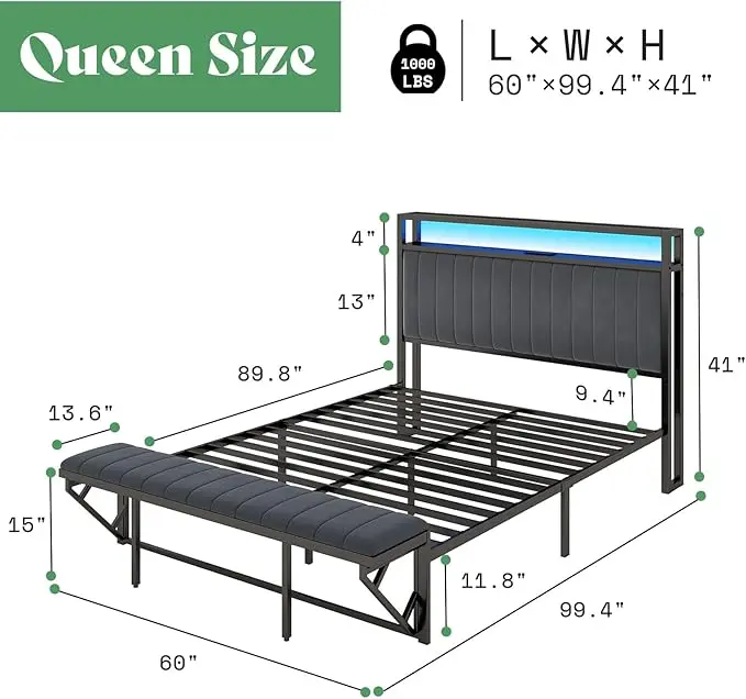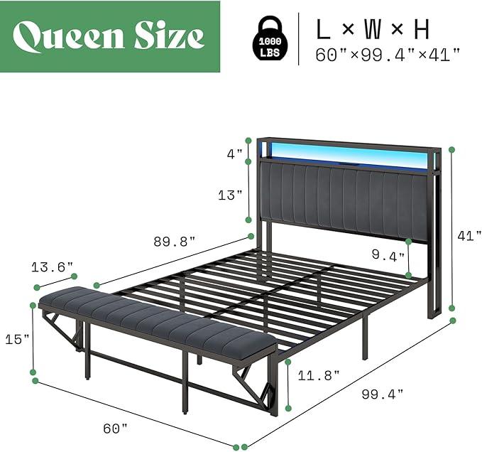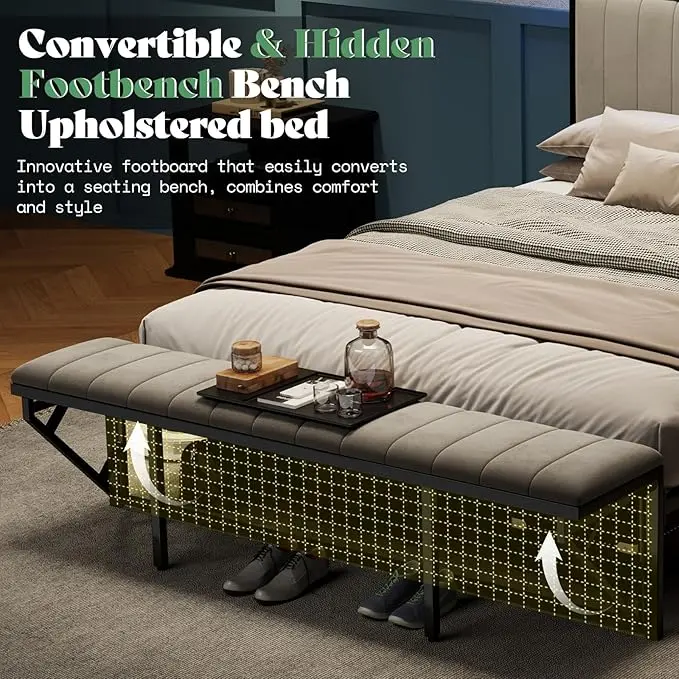 ·[Bed Storage with Hidden Bench] Hidden ottoman footboard doubles as a seating area, seamlessly integrating into the bed frame. Elevated 11.8" under bed space for ample storage