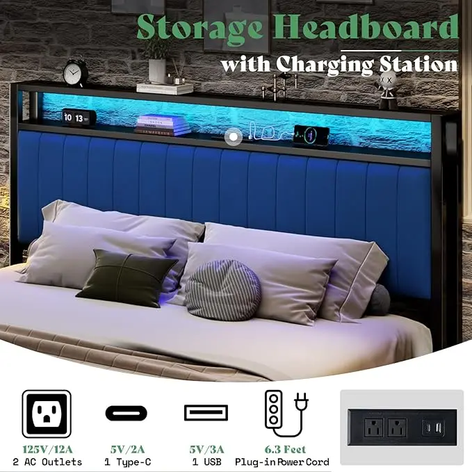 ·[Versatile Headboard with Charging Station] Functional 5.5" deep Headboard includes storage shelves and a charging station with USB/ Type-C ports and sockets