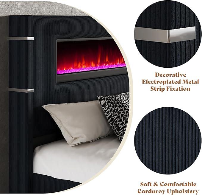 Fireplace Bed Frame: 45” Non-heating electric fireplace features 16-color flame and crystals with five levels of adjustable brightness. Comes with a handy remote control for convenience