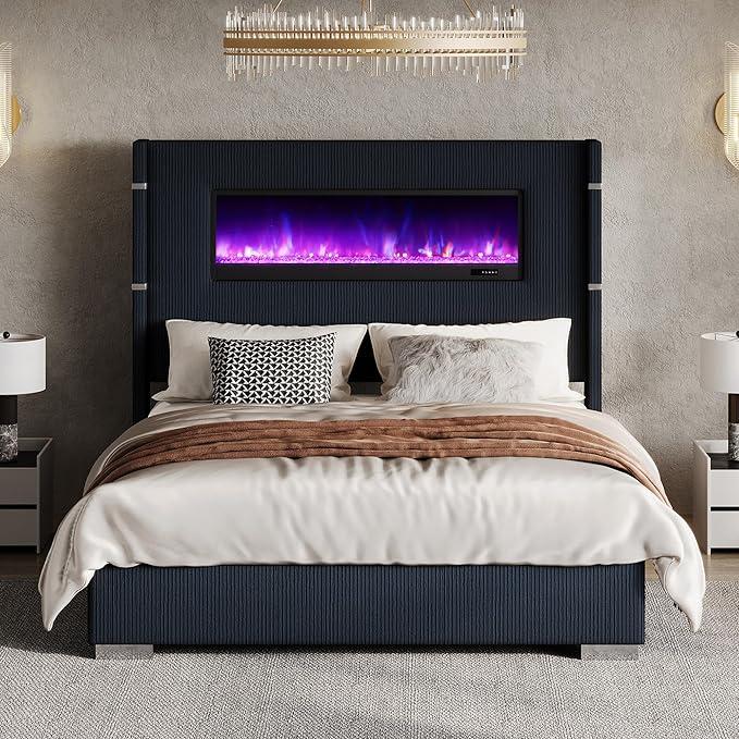 Enjoying my new bed frame  AMERLIFE Modern Bed Frame with Fireplace, Wingback Platform Bed with 60.4" Extra Tall Headboard, Corduroy Upholstered Bed Wooden Slats #tiktokshop #comeshopwithme