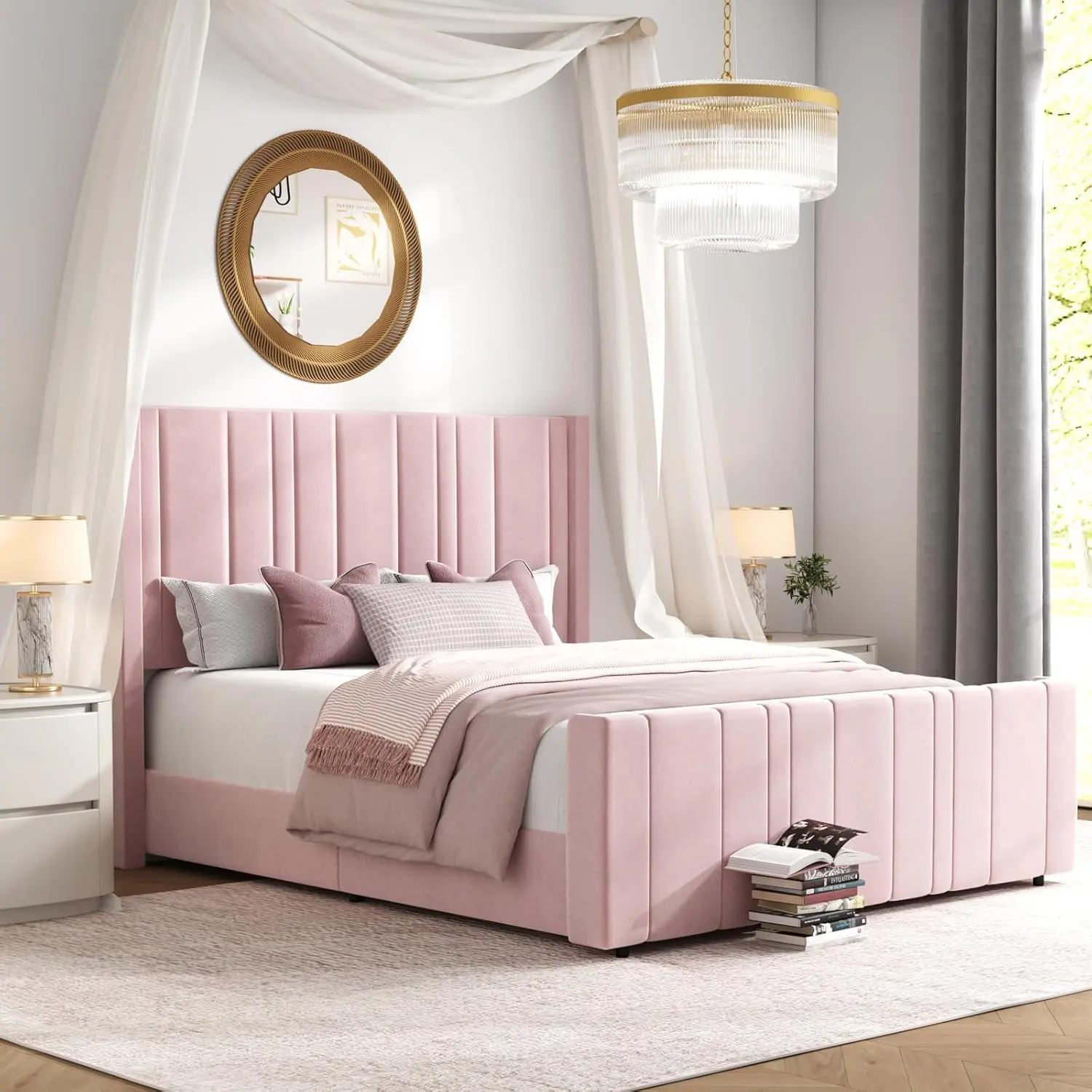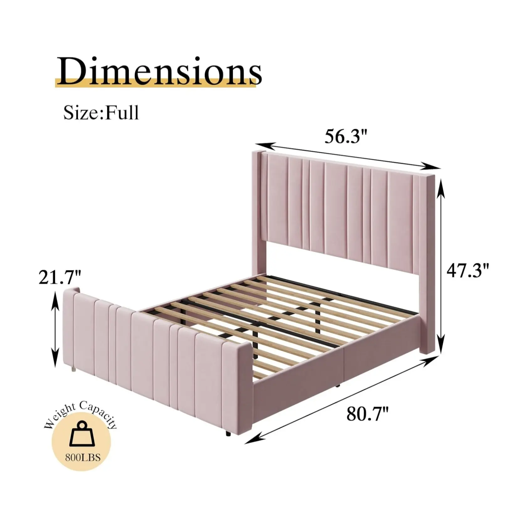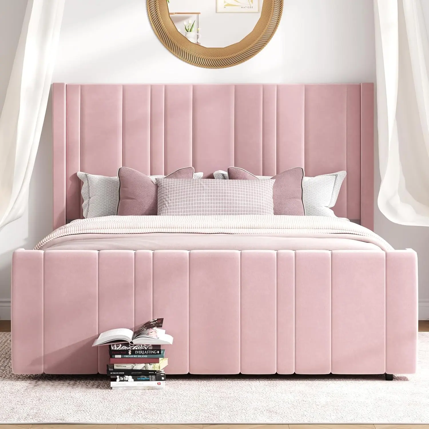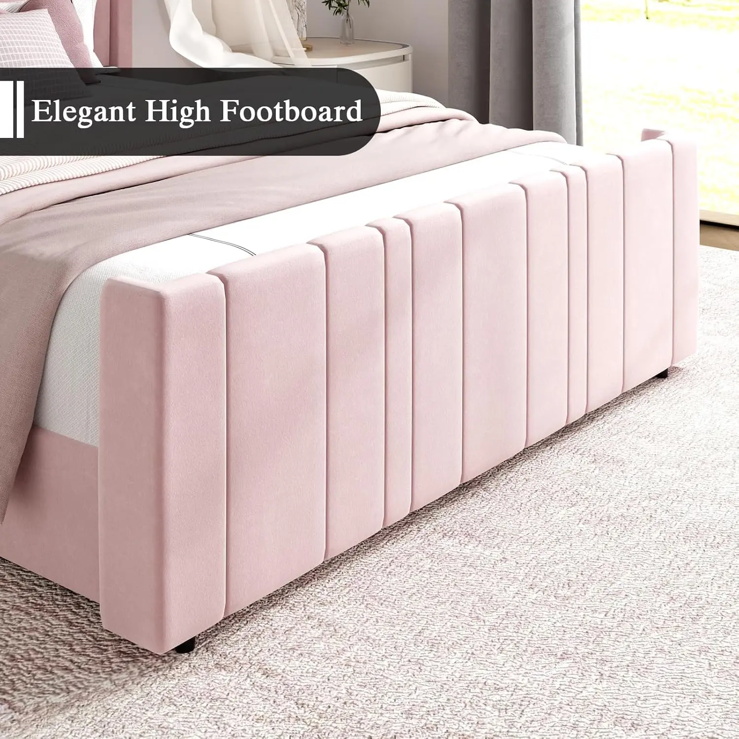 ·Vertical Channel Design: This soft bed frame has an 47.3" headboard and 21.7" footboard to keep the mattress from sliding. The upholstered bed frame features velvet vertical channel in soft fabric and provides extra support for your neck and back