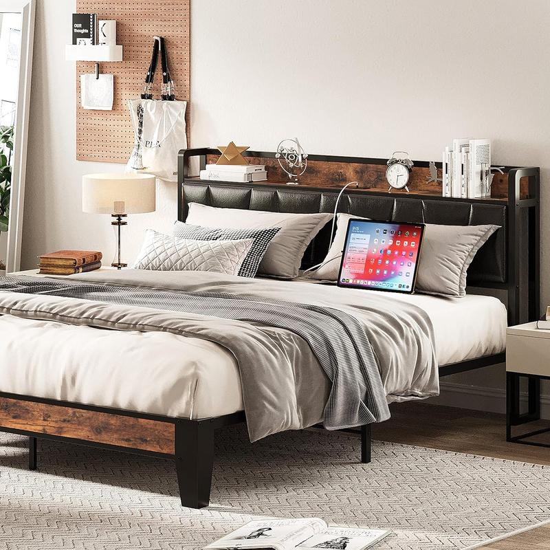 ·Practical and Comfortable: Vintage shelf and black PU upholstered headboard combine practical and comfortable to match any style of the room. Queen Bed Dimensions : L*W*H: 85.4 * 62.2 * 40.6 "