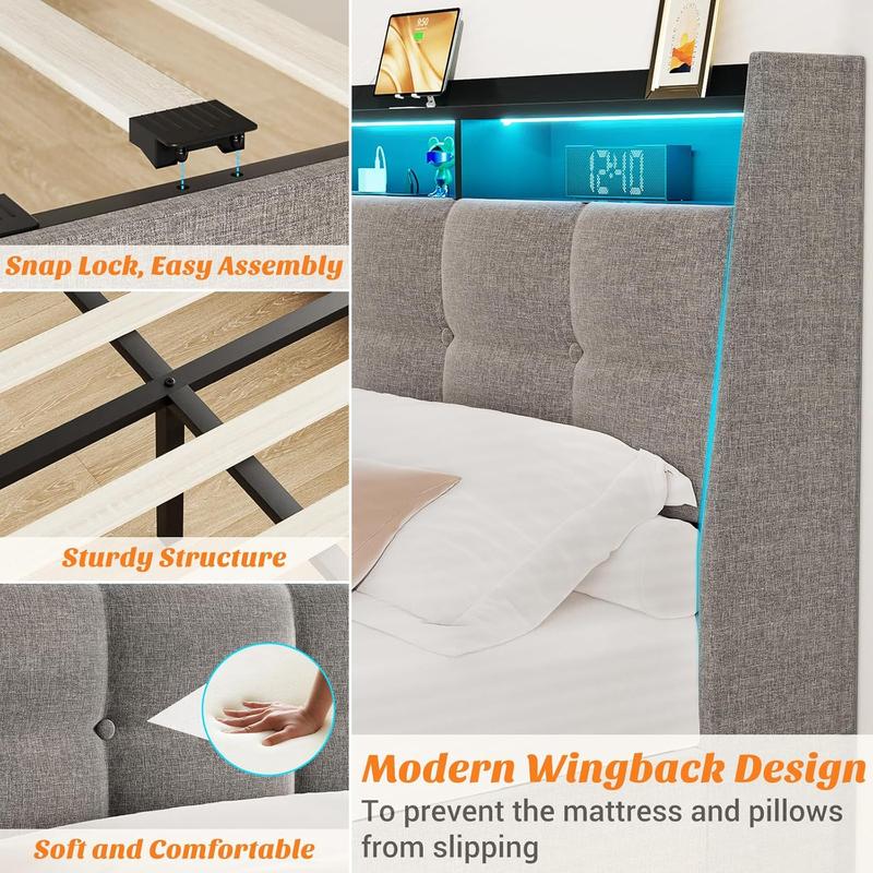 The storage headboard includes a built-in charging station with three power outlets, two USB ports, and a 6.56ft power cord for easy access to charge smart devices. Choose from over 60,000 LED colors, customize brightness, mode, and timer settings, and sync the lights to music for a live concert atmosphere.