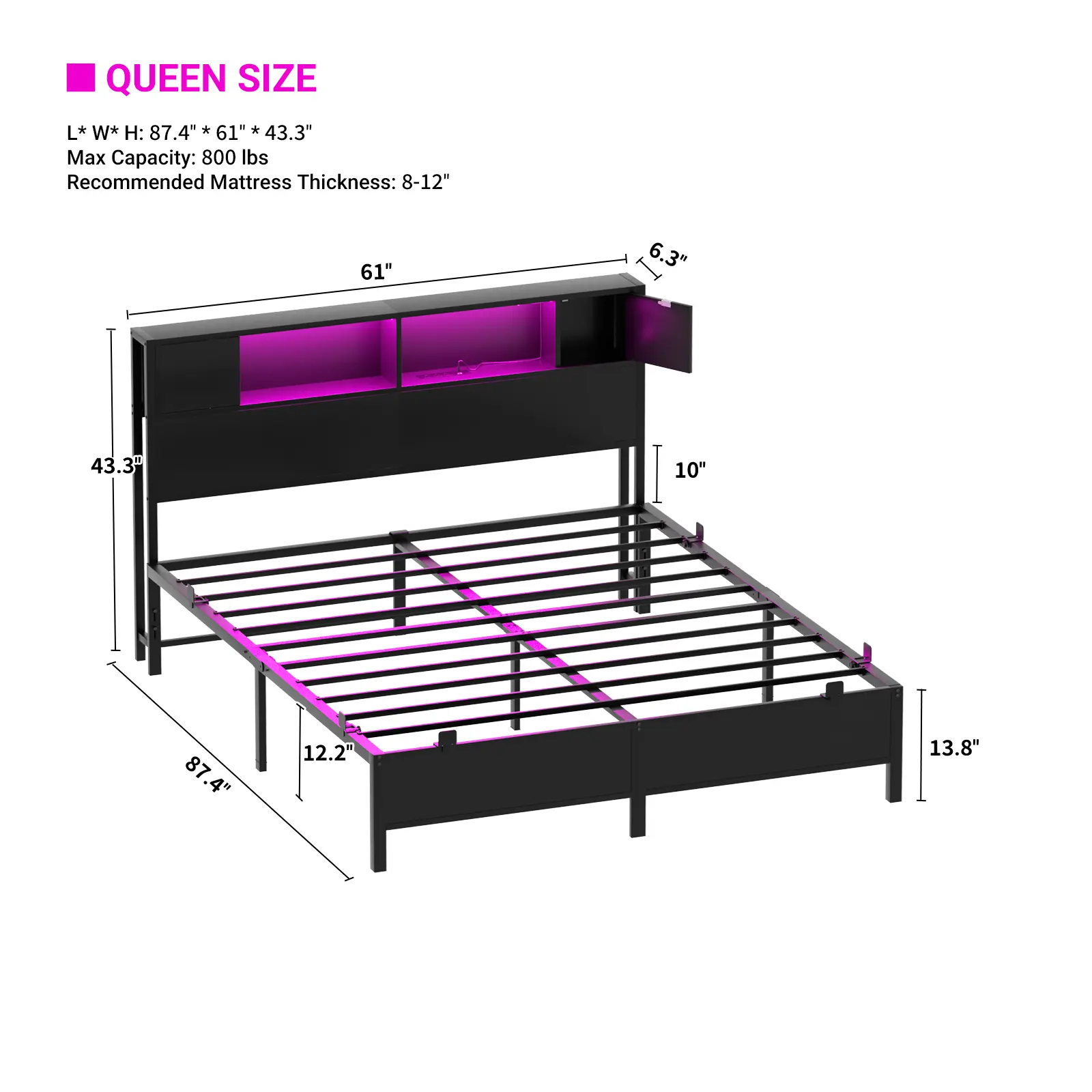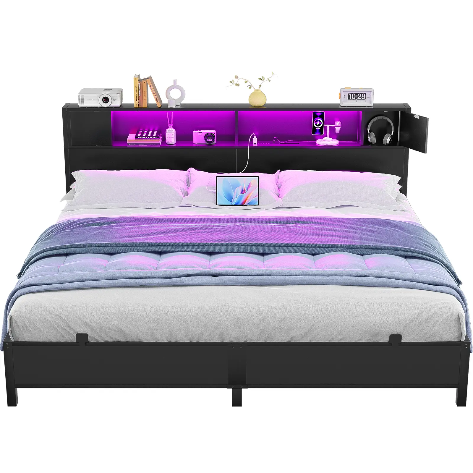 Storage Headboard with 2 Side Cabinets: The bed frame features a practical headboard with 4 compartments, and the top leaves ample 6.3-inch broad space that can be used as a storage shelf.
