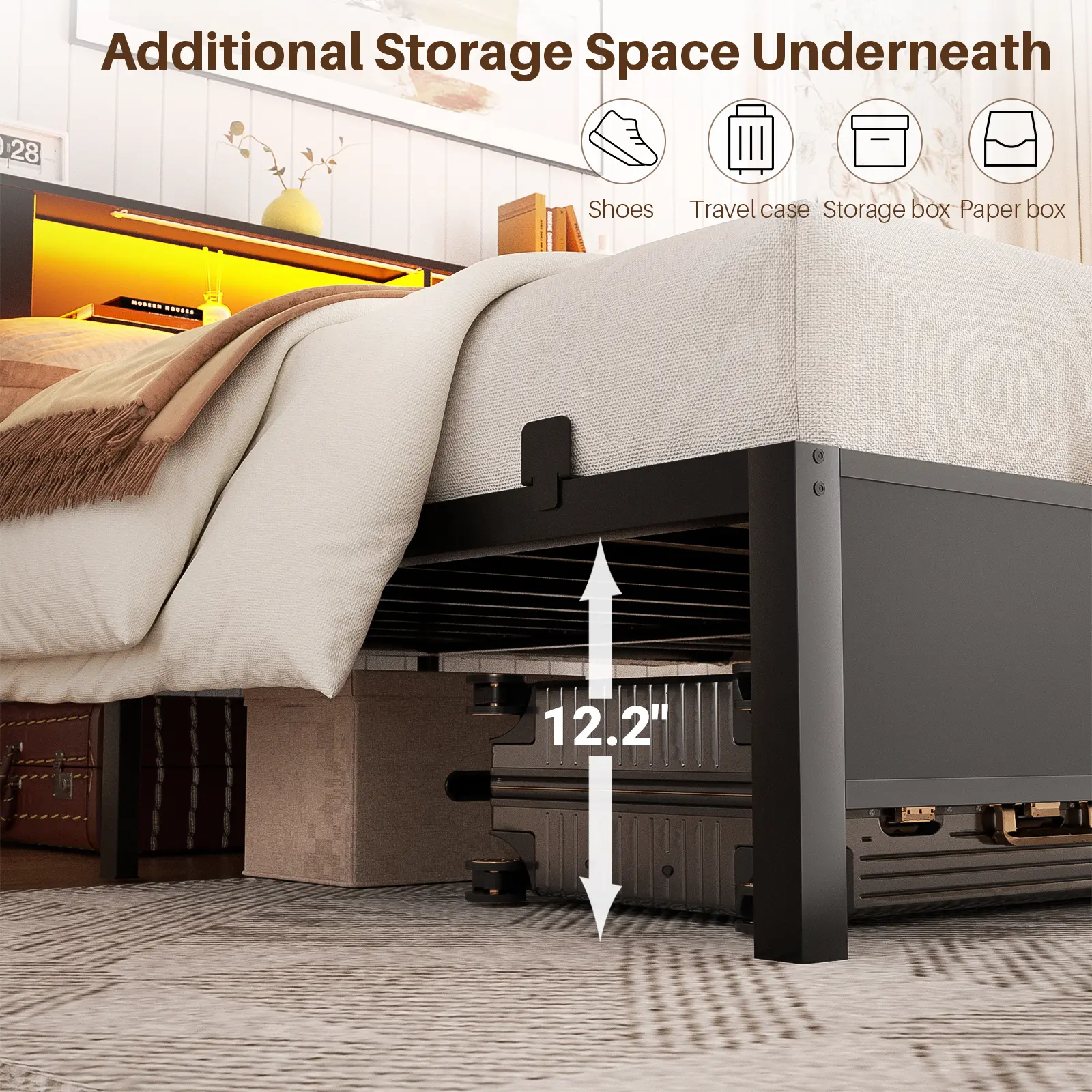 Non-Slip Mattress Brackets & Underbed Storage: 6 sturdy metal brackets are provided with the bed frame to prevent your mattress from slipping or moving. With a generous clearance of 12.2” underneath the bed, you can easily store various items.