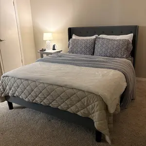 Box Spring Not Required: Designed to be used without a box spring for added convenience. Decorative Design: Features an elegant button tufted wingback headboard. Multiple Sizes: Available in Full, Queen, and King sizes to fit various bedroom spaces. Simple Assembly: Easy to set up without the need for complex tools. Strong Support: Upheld by sturdy wooden slats for maximum stability. Upholstered Finish: The bed frame is upholstered, enhancing its aesthetic appeal. Fyi: If you love the bedsheets and decor its all in our tiktok shop.  #bedroom #bedroomdecor #bedroomdesign #bedroominspo #homedecor