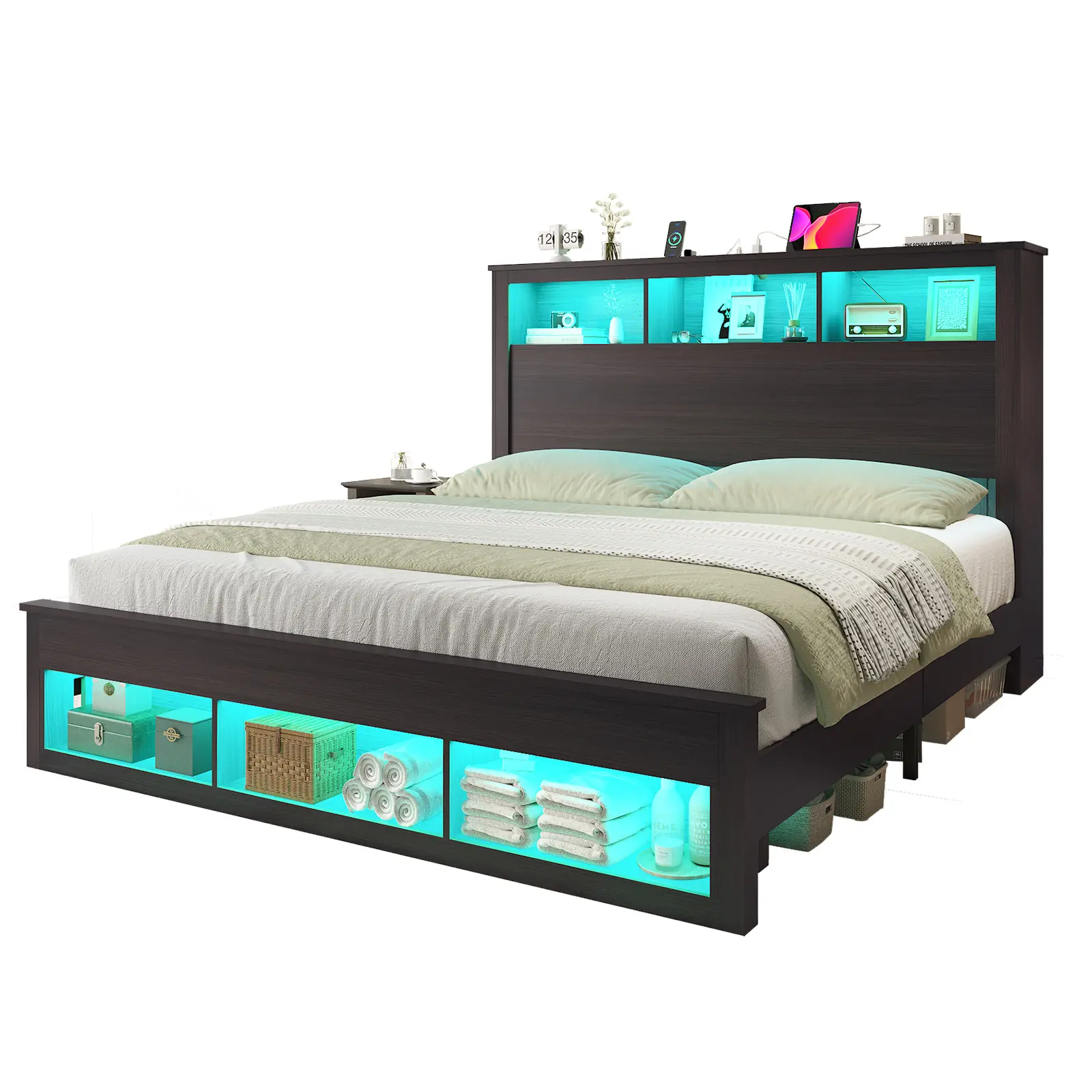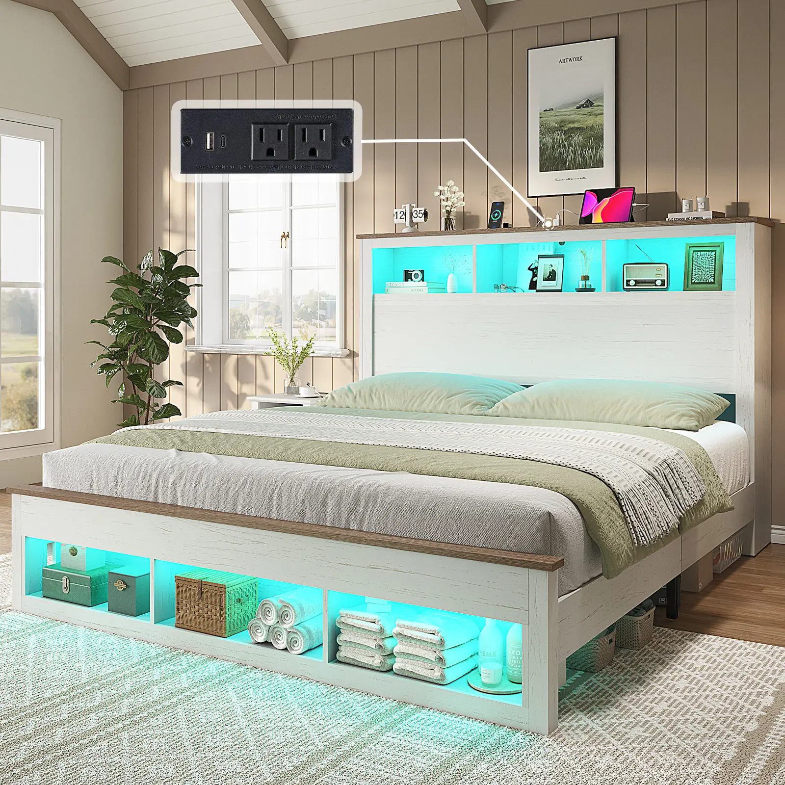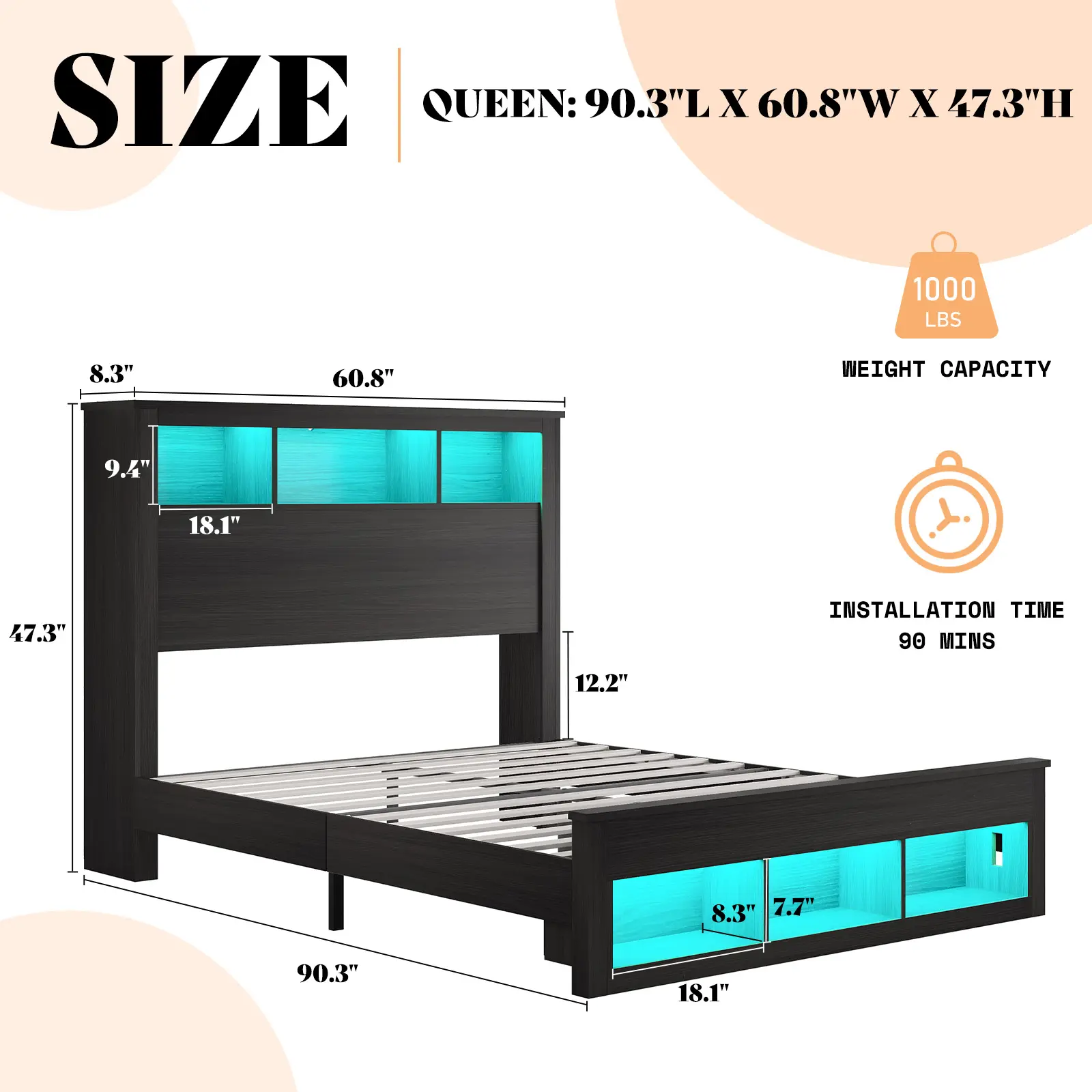 AMERLIFE Bed Frame with Bookcase Storage Headboard and Footboard, LED Platform Bed with Charging Station, No Box Spring Needed, Noise Free/Best Gift Ideas/Christmas Gifts