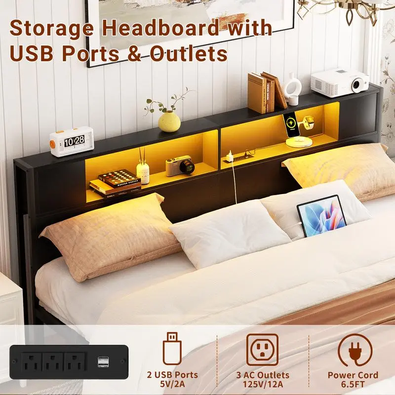 ·Convenient Charging Station with LED Strip: The open shelf on the storage headboard contains a built-in power strip charge station with 3 power outlets and 2 USB ports, a 6.56ft long power supply cord for easy access to charge your smart devices. There are over 60,000 colors to choose from, you can customize the brightness, color, mode, and timer settings. LED lights can sync to music to create the atmosphere of a live-at-home concert.