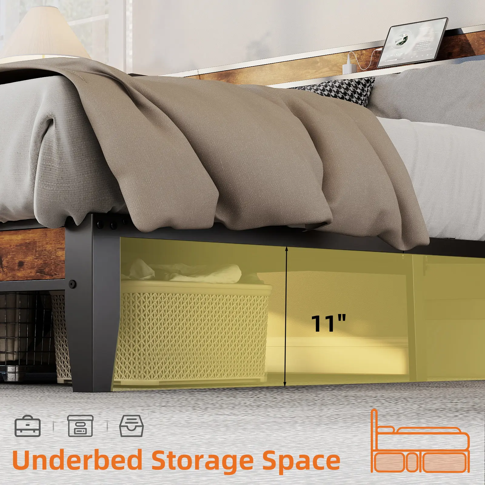 Bed Frame with Headboard,Spacious Underbed Storage,Integrated Charging Station,Durable Squeak-Free Frame,Simple No-Tool Assembly,Works with Full Mattress No Box Spring Required