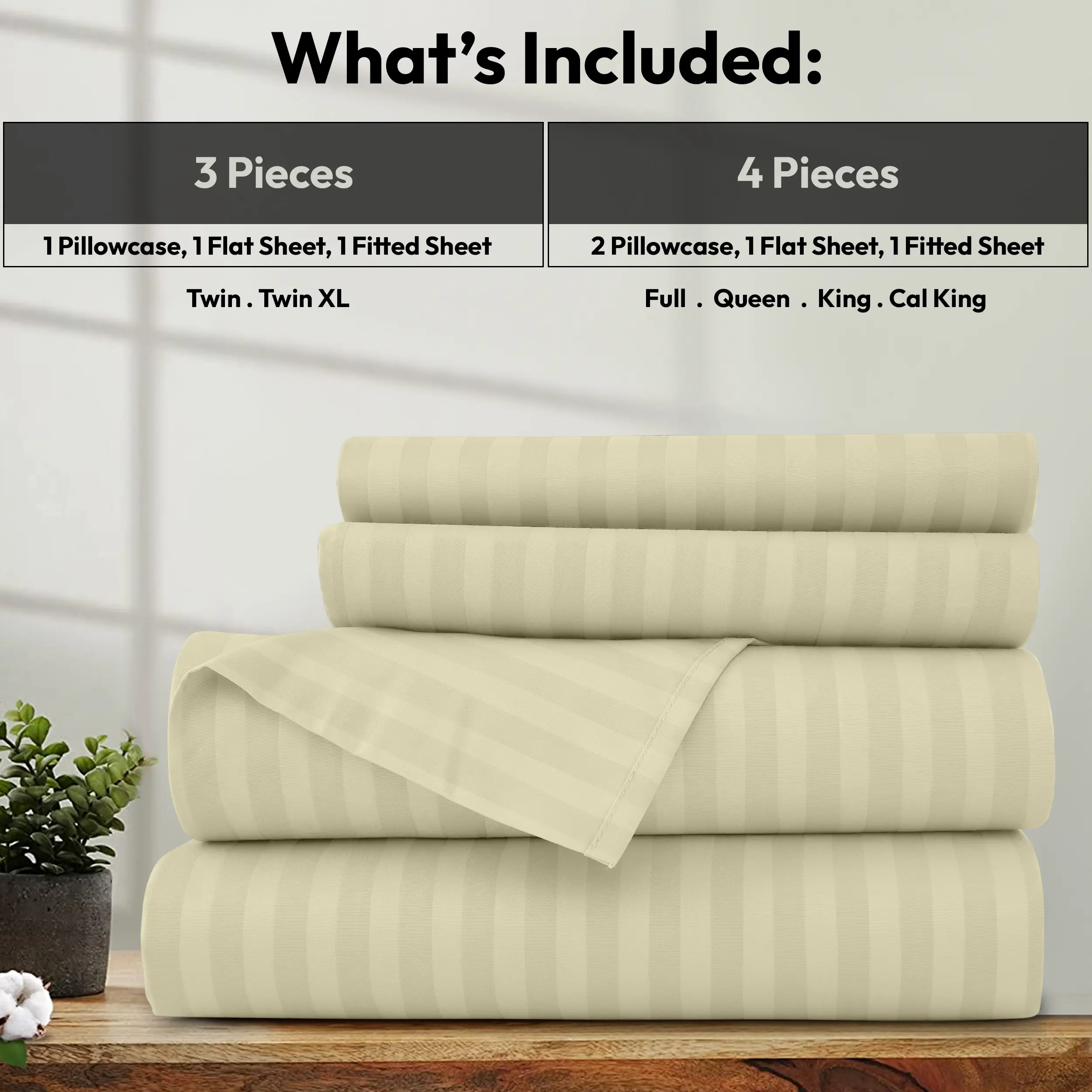 Our Twin & Twin XL is 3 Piece Set which includes 1 flat sheet, 1 fitted sheet and 1 Pillowcase.