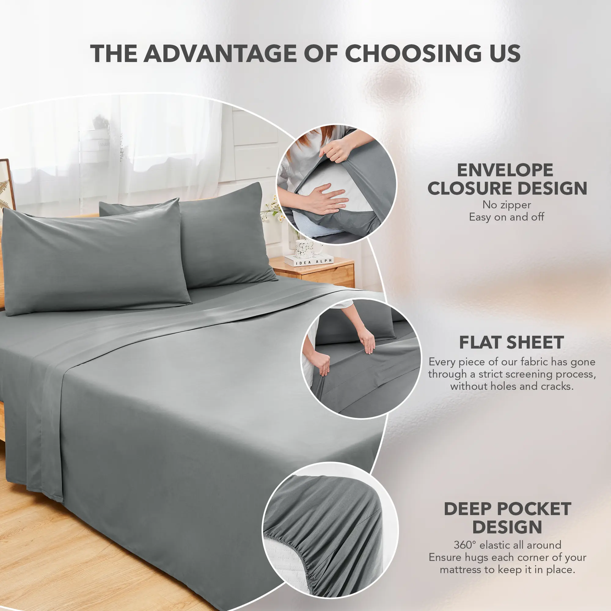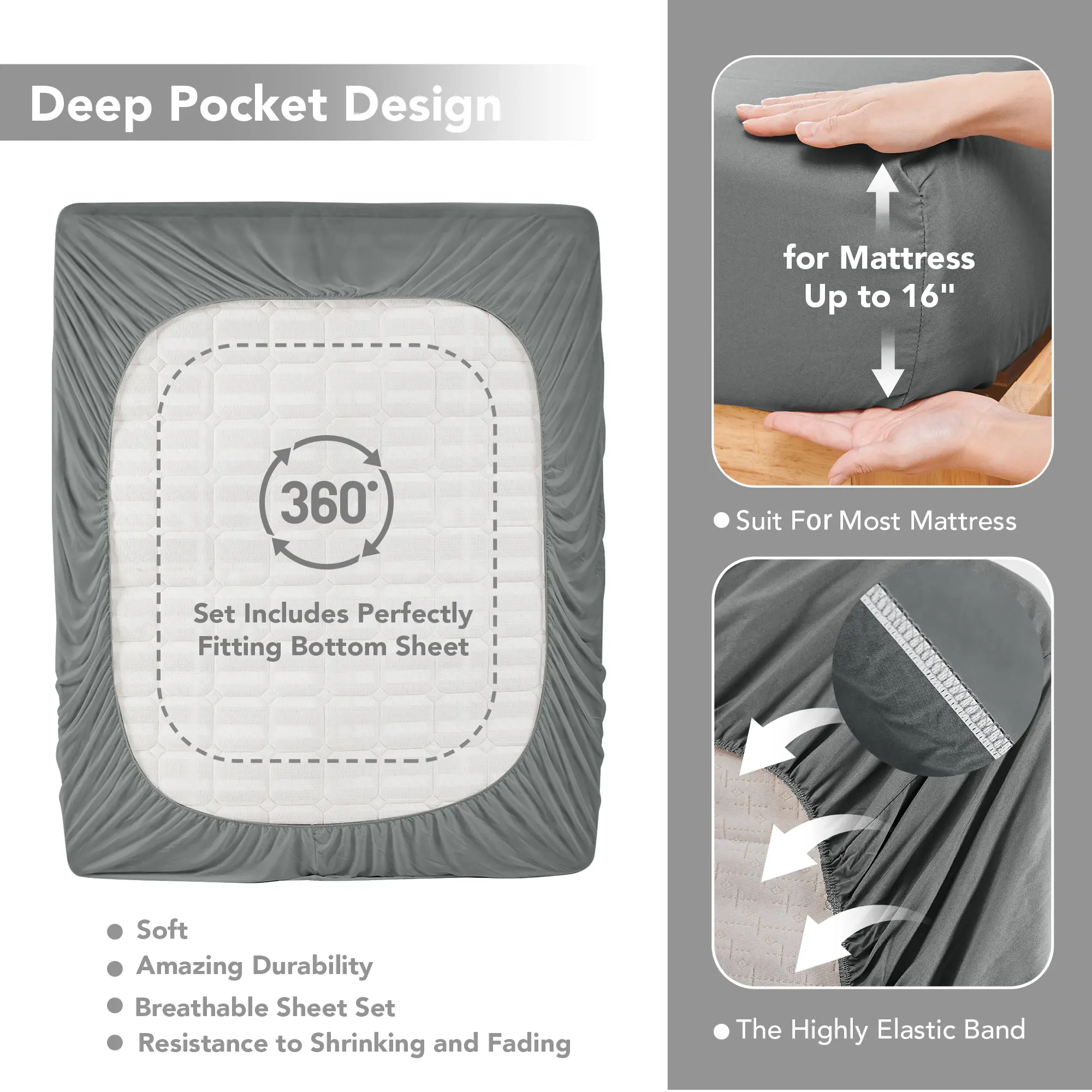 Great set of sheets. The fitted sheet covers or 15” mattress easily and light gray looks excellent in our guest room. Pillow cases worked well on our queen sized pillows. They’re not the heaviest fabric density I’ve ever bought, but for the price, they are a super value.