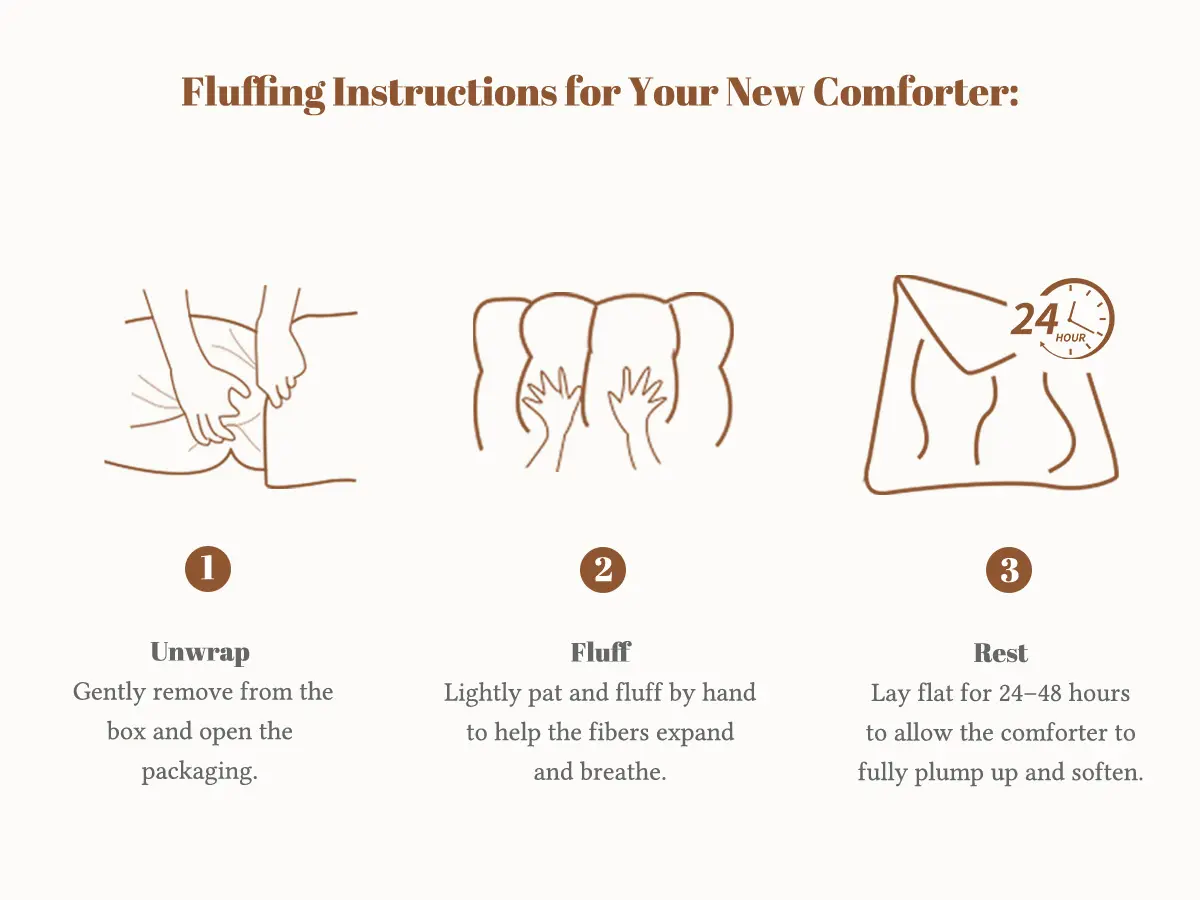 ·User Guide: After unpacking, gently fluff the duvet and allow it to rest for 24 to 48 hours to restore optimal loft.