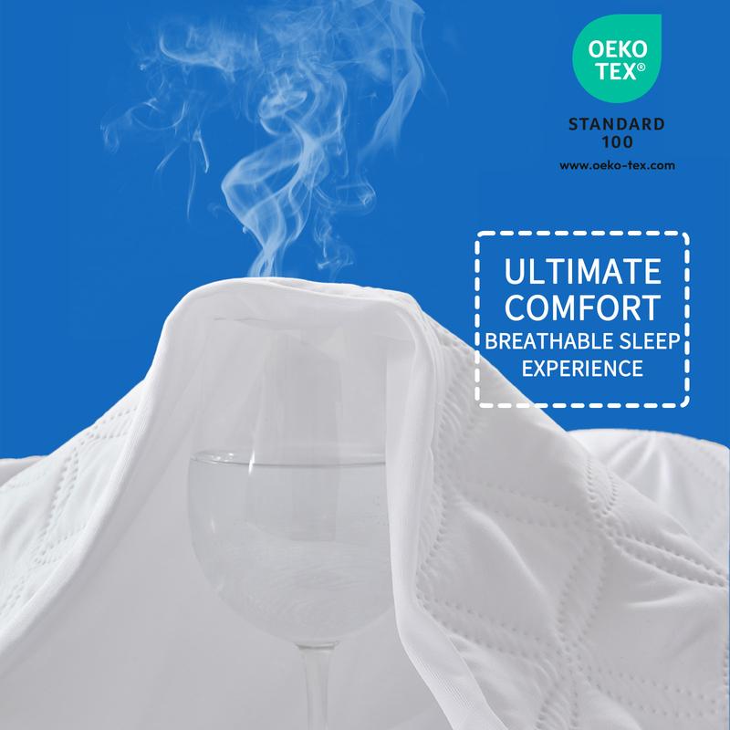 ·【360° Deep Pocket Design】All-around high-rebound elastic skirt of the waterproof mattress pad fitting most types of mattresses depth up to 18" tightly. No worry of a messy bed anymore.