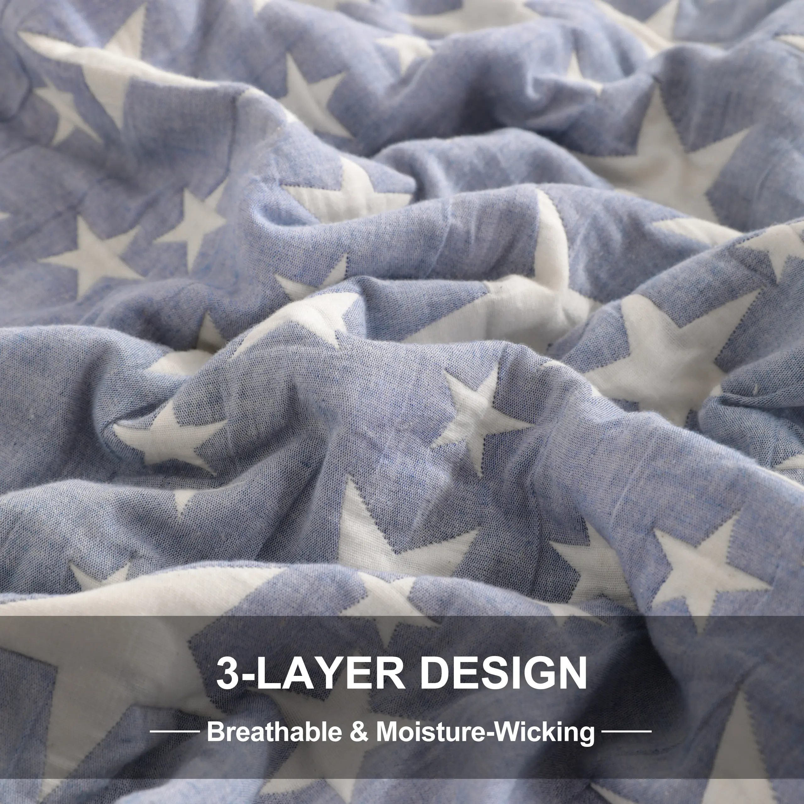 Each fabric is natural, which becomes softer and more comfortable with each wash. Crafted with three layers of soft cotton gauze and a warm synthetic fiber layer in between, all woven together at once using jacquard technology.