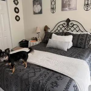 I love love love this comforter set! I have a queen bed and ordered the queen size. It’s the perfect length!! It’s silky soft and goes with my decor. Also, that’s my dog Summer in the picture ❤️