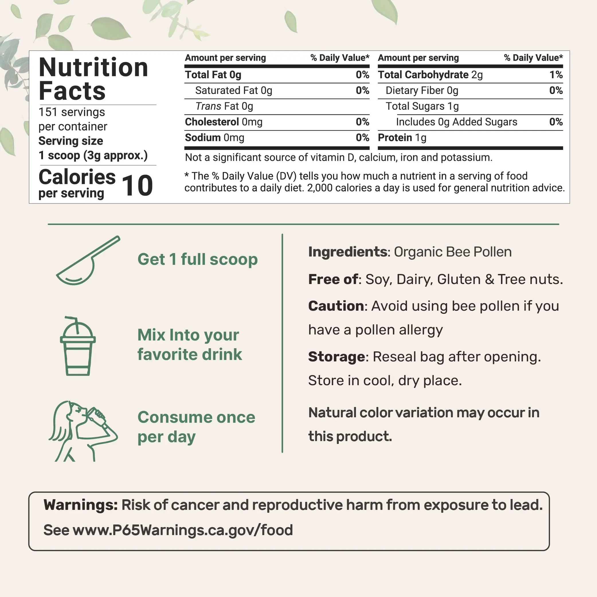 ·Each pouch contains a 1 pound supply of real organic bee pollen granules and provides up to 151 total servings. A great additive for smoothies, yogurt, tea, oatmeal, or any of your favorite recipes.