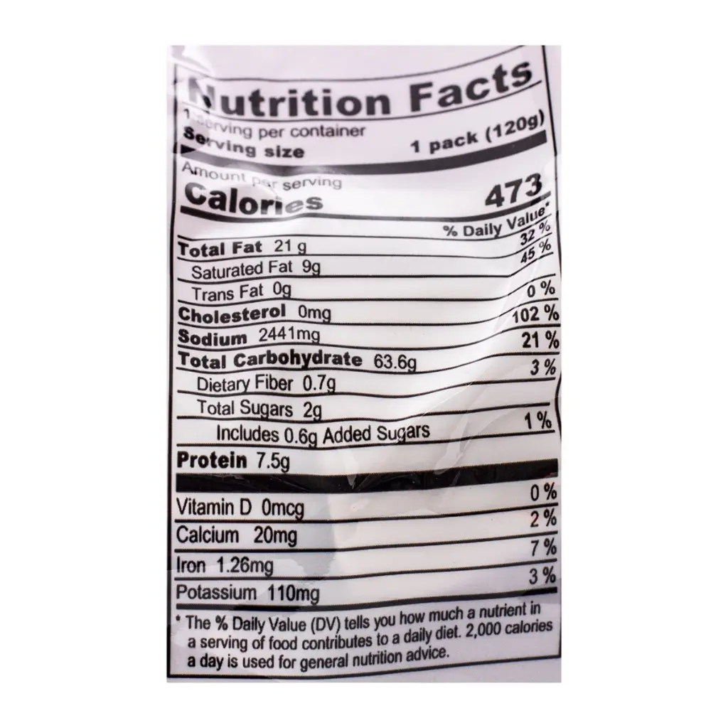 Seasoning Pack: Salt, MSG, Sugar, Starch Acetate, Yeast Extract, Garlic Powder, Citric Acid, Caramel, Dehydrated Scallion, Hydrolyzed Soybean Protein, Disodium lnosinate, Disodium Guanylate, Spices, Refined SoybeanOil, Silicon Dioxide, Guar Gum, Artificial Beef Flavouring.
