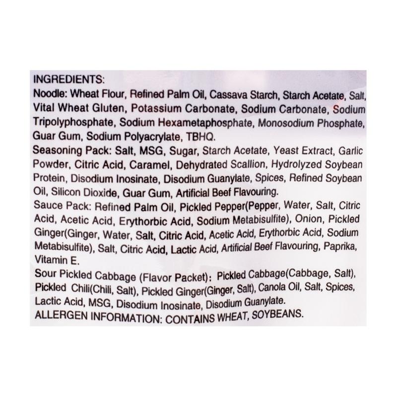 Sauce Pack: Refined Palm Oil, Pickled Pepper(Pepper, Water, Salt, Citric Acid, Acetic Acid, Erythorbic Acid, Sodium Metabisulfite), Onion, Pickled Ginger(Ginger, Water, Salt, Citric Acid, Acetic Acid, Erythorbic Acid, Sodium Metabisulfite), Salt, Citric Acid, Lactic Acid, Artificial Beef Flavouring, Paprika,Vitamin E.