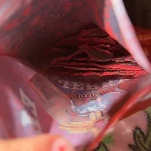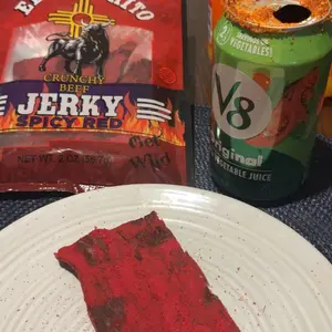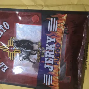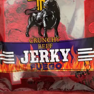 El Ranchito Jerky presents the Spicy Red Fuego 2oz. Made with 100% beef, this jerky features iodized salt, maltodextrin, and natural/artificial flavors. It contains monosodium glutamate, citric acid, and hydrolyzed vegetable protein soy. The mix of chili peppers and non-hydrogenated RBD soy vegetable oil adds flavor. FD&C Red #40, added sugars, garlic, onion, inosinate, and sodium guanylate are also present. Contains soy.