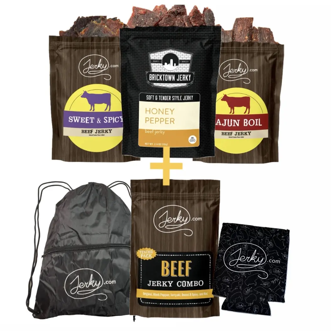 Joey's Favorites Big Bundle - Sweet & Spicy Beef, Soft & Tender Honey Pepper Beef, Cajun Boil Beef + Beef Jerky Sampler, Drawstring Backpack & Koozie- All-Natural, No Added Preservatives - 12.5 oz