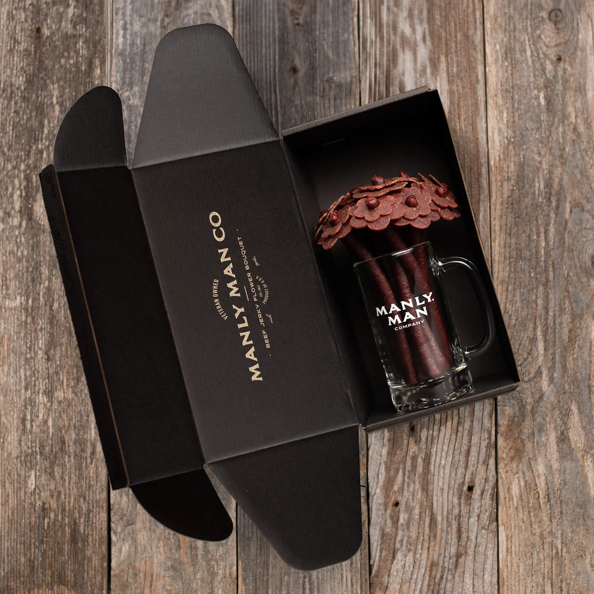 Our Beef Jerky Flower Bouquets are 100% edible and truly are made for that rugged one of a kind, hammer swinging, IPA drinking, duck hunting, beast of a man-animal you call yours! This broquet comes fit for a Manly Man, in a 16oz. Manly Man tankard beer mug.