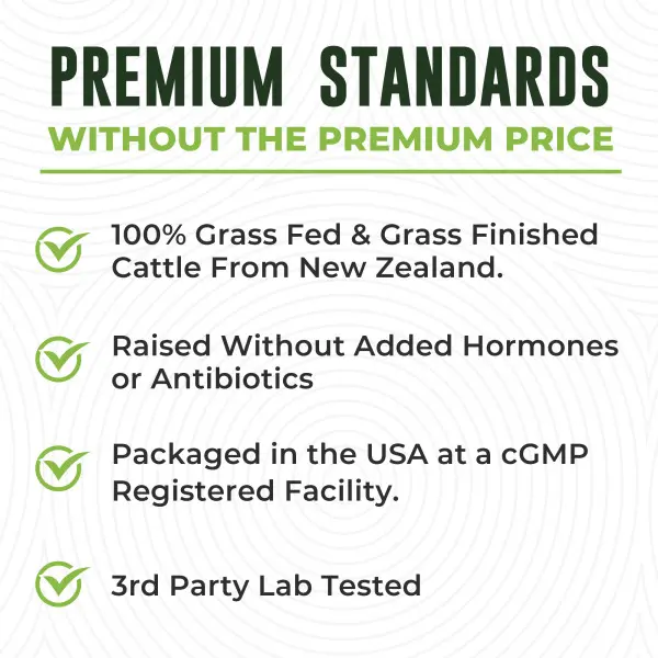 ·SOURCE MATTERS: Free Range, Pasture Raised, and 100% Grass-Fed and Grass Finished Bovine from New Zealand. Raised without genetically engineered feed, antibiotics, or added hormones from birth to harvest. Packaged in the USA at a cGMP registered facility.