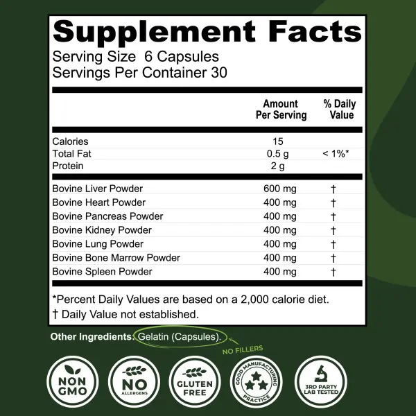 ·FEEL THE DIFFERENCE: Grass-Fed bovine organs are high in vitamins and bioavailable enzymes. Our Beef Organ Complex supports increased energy*, promotes overall health and wellness*, and supports immune and digestive health*. Take 6 capsules daily, or if you’re new to organ supplements, start by taking 1-2 capsules daily for the first couple days then increase by one capsule daily.