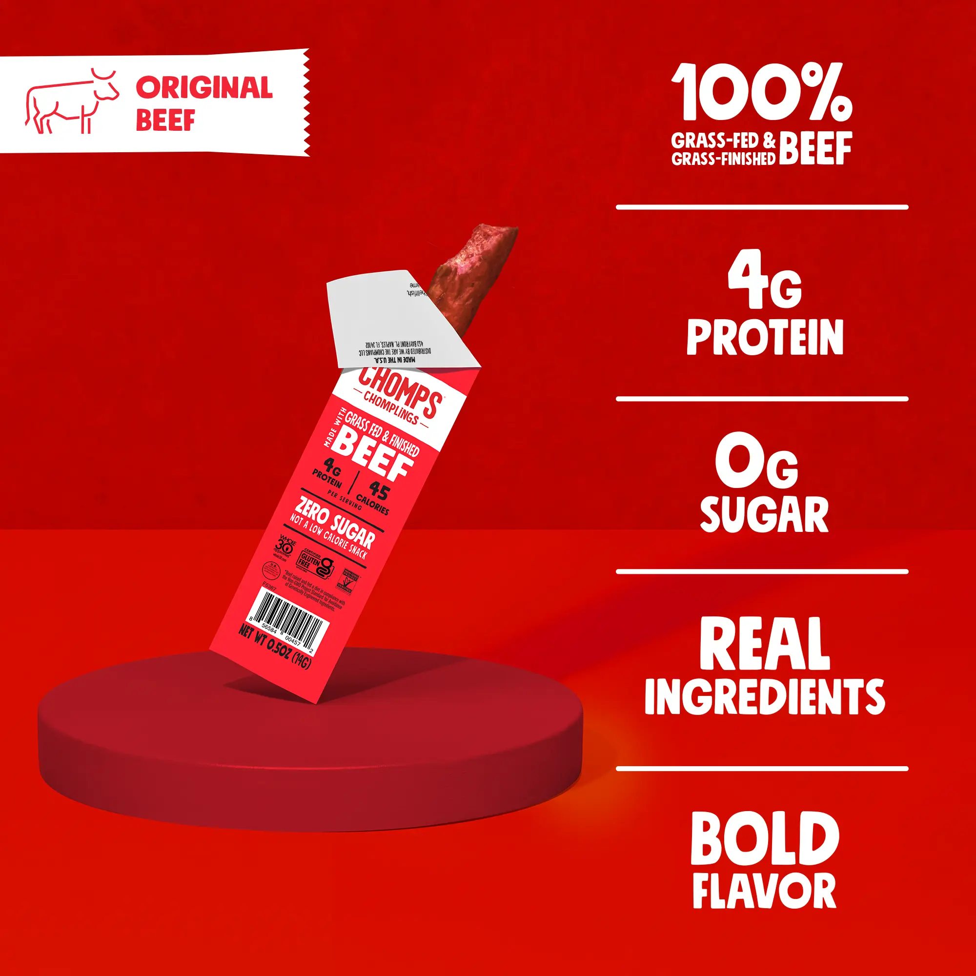 Chomps Original Flavor grass-fed and finished mini beef jerky features the same savory taste that first made Chomps popular: slightly smoky and slightly spicy. The taste is sure to make every snack time a mouthwatering experience. We use grass-fed and finished beef so you can feel good about what you and your family are eating.