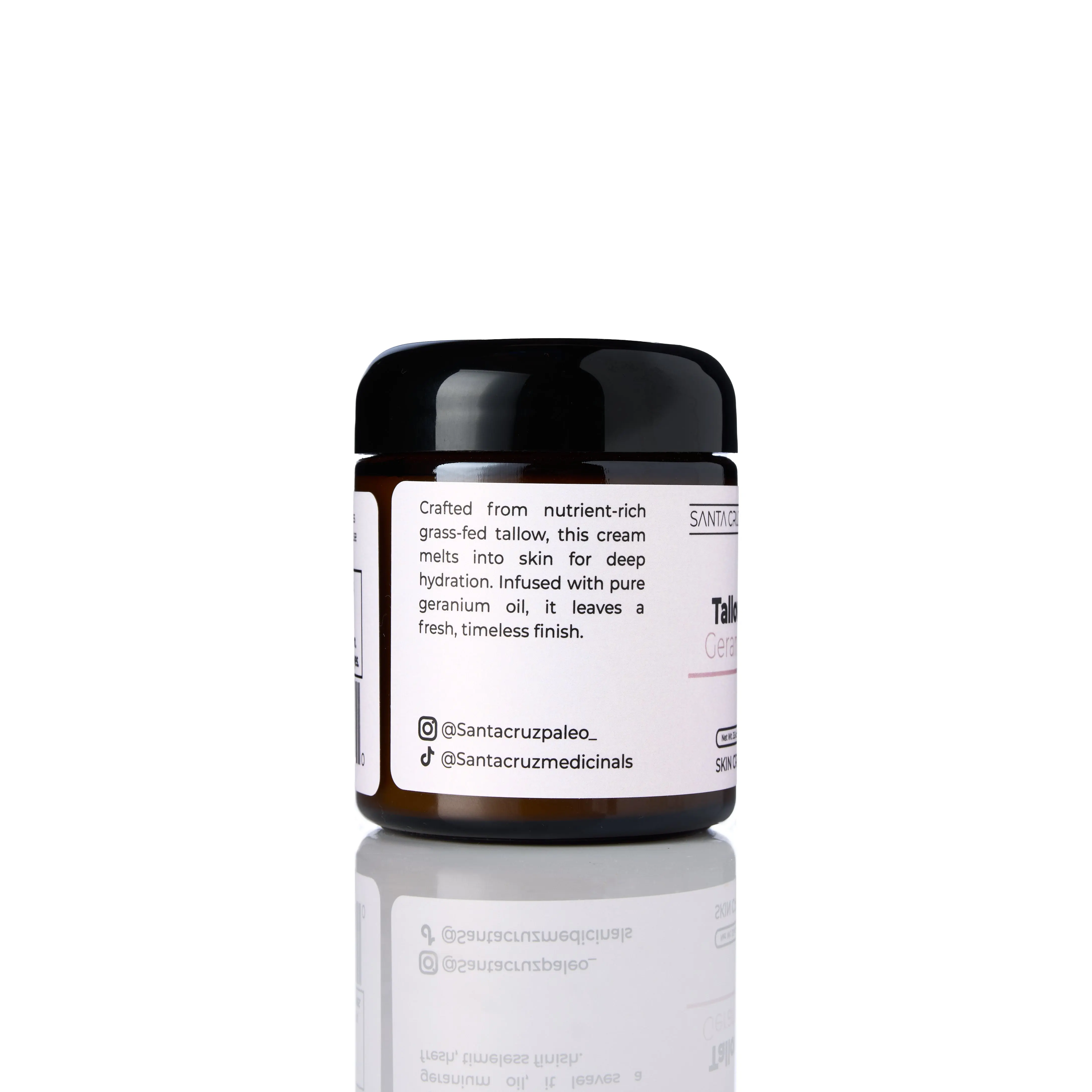 Our Santa Cruz Paleo Moisturizer features a blend of grass-fed beef tallow, and organic geranium oil, offering deep hydration for all skin types. This all-natural, chemical-free formula nourishes, soothes, and rejuvenates skin, providing essential moisture and antioxidant protection.