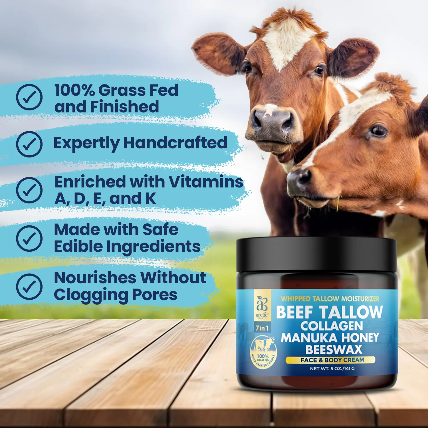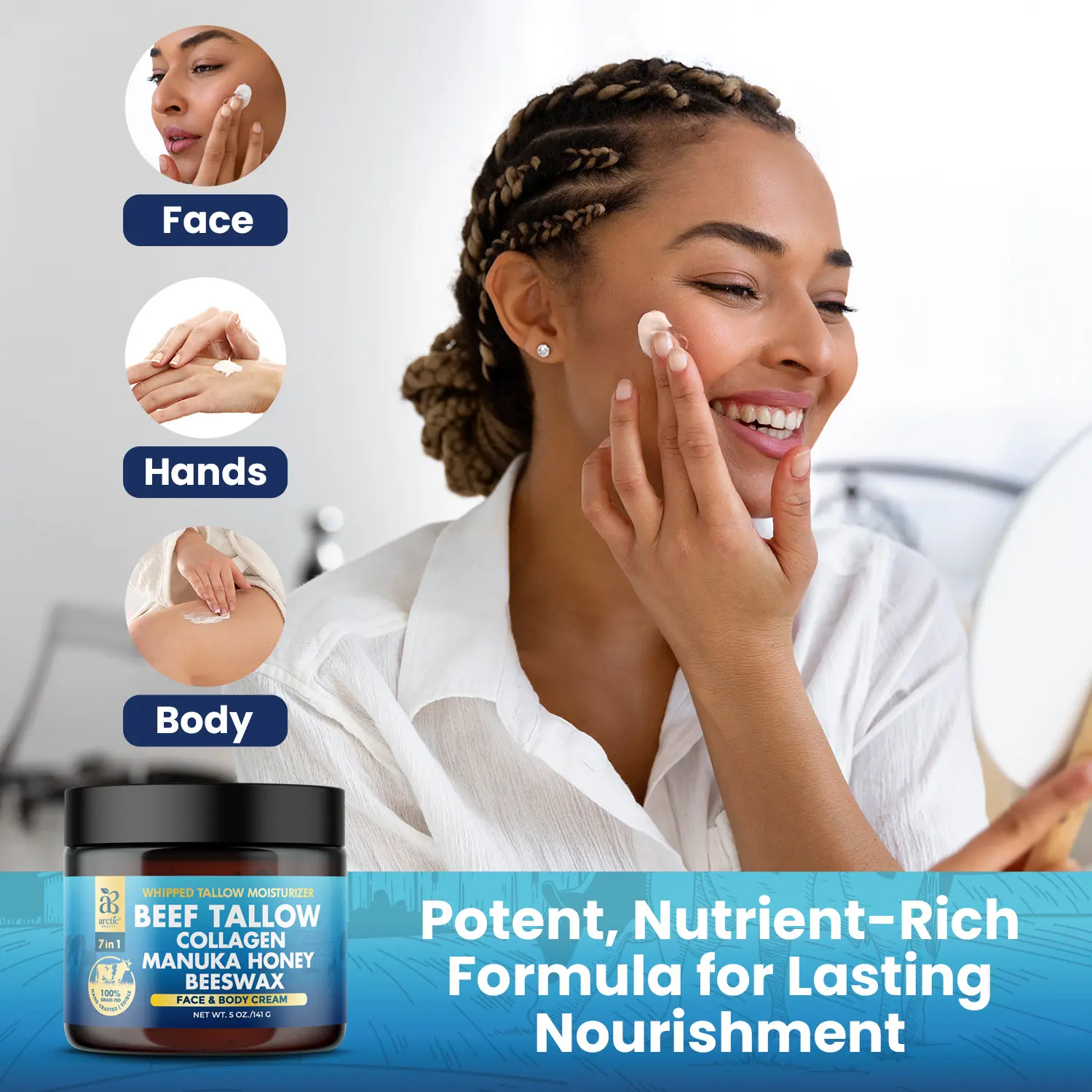 Experience deep nourishment with our All-in-One Beef Tallow Moisturizer, crafted with premium, natural ingredients to revitalize your skin.