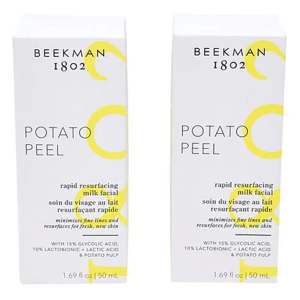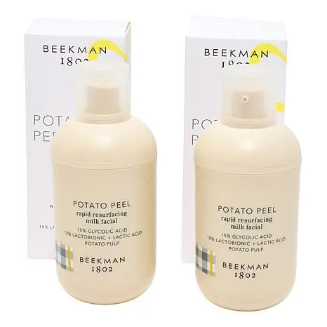 Beekman 1802 Rapid Resurfacing Milk Facial Exfoliant Treatment 2-pack What It Is An exfoliating treatment shown to help improve the look of skin texture, reduce the look of rough skin for smoother looking skin, uncover "fresh" topical skin, help improve the look of fine lines and wrinkles, brighten the look of skin, diminish the look of pores and help dull skin appear more radiant. What You Get (2) 1.69 oz. Rapid Resurfacing Milk Facial Treatments What It Does Contains moisturizers known to temporarily plump the appearance of skin, help diminish the appearance of fine lines and wrinkles, and help hydrate/ moisturize/ nourish skin with moisture Contains goat milk, rich in vitamins Contains potato pulp extract, which contains abundant starch, vitamins B6, and C Contains Vitamin E, an antioxidant that may help fight against free radical aggressors Free of fragrance, alcohol, paraben, sulfate, formaldehyde, phthalate, and talc Consumer Perception Survey In a consumer perception survey with participants using this product after 1st application, 91% agreed this product left their skin soft.