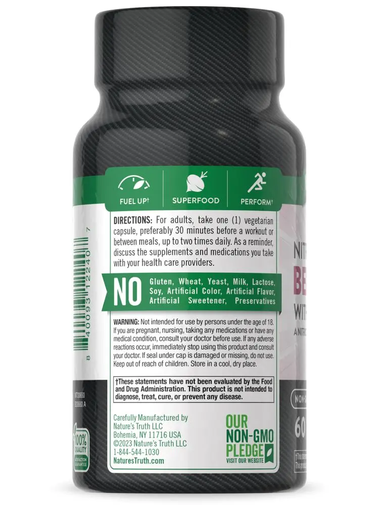 Our mission at Nature’s Truth is to meet your wellness needs with products that go above and beyond. Nature’s Truth provides supplements in various delivery forms to suit every preference. Our Beet Root is vegan, non-GMO, and free of gluten, wheat, yeast, milk, lactose, soy, artificial color, artificial flavor, artificial sweetener, and preservatives.