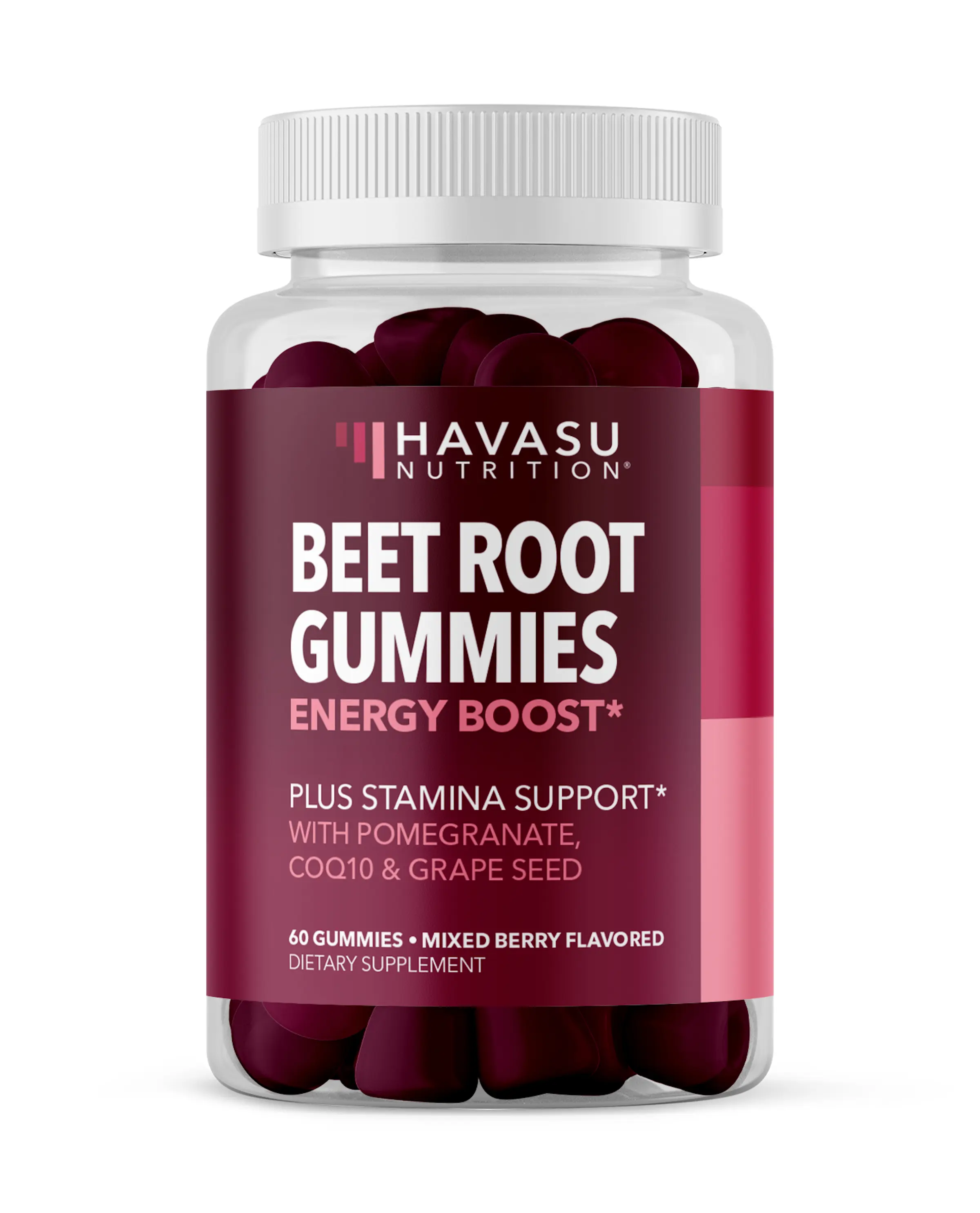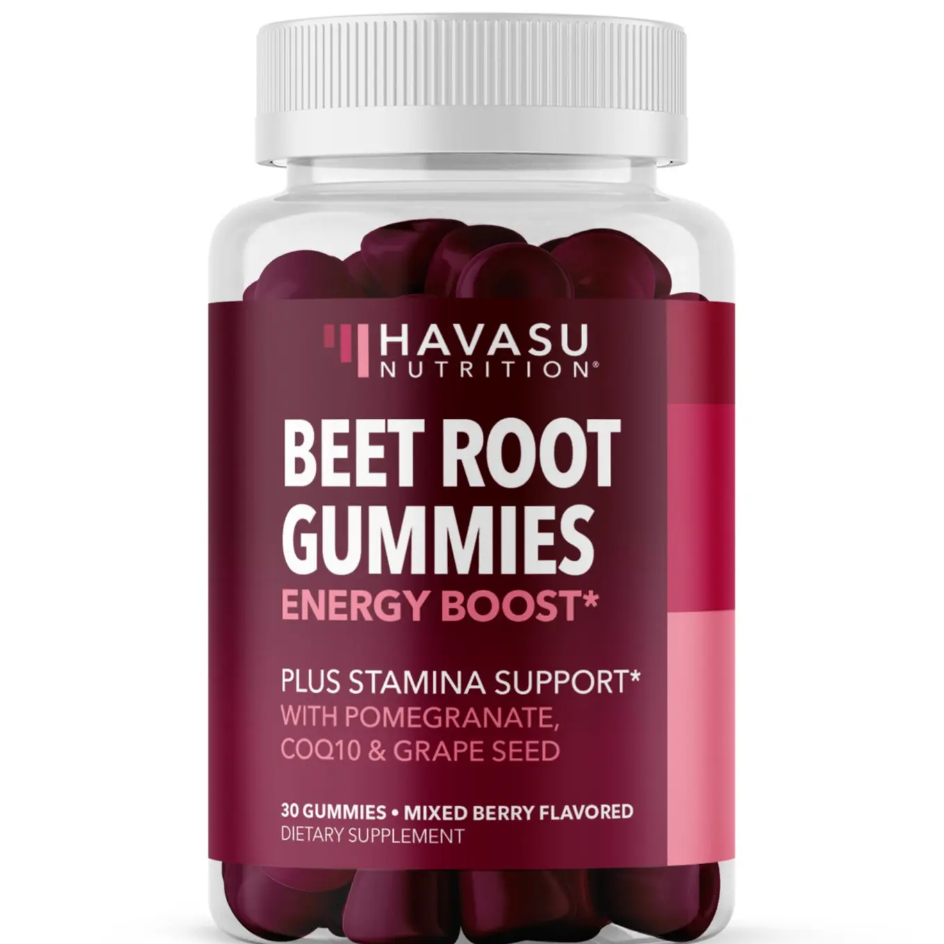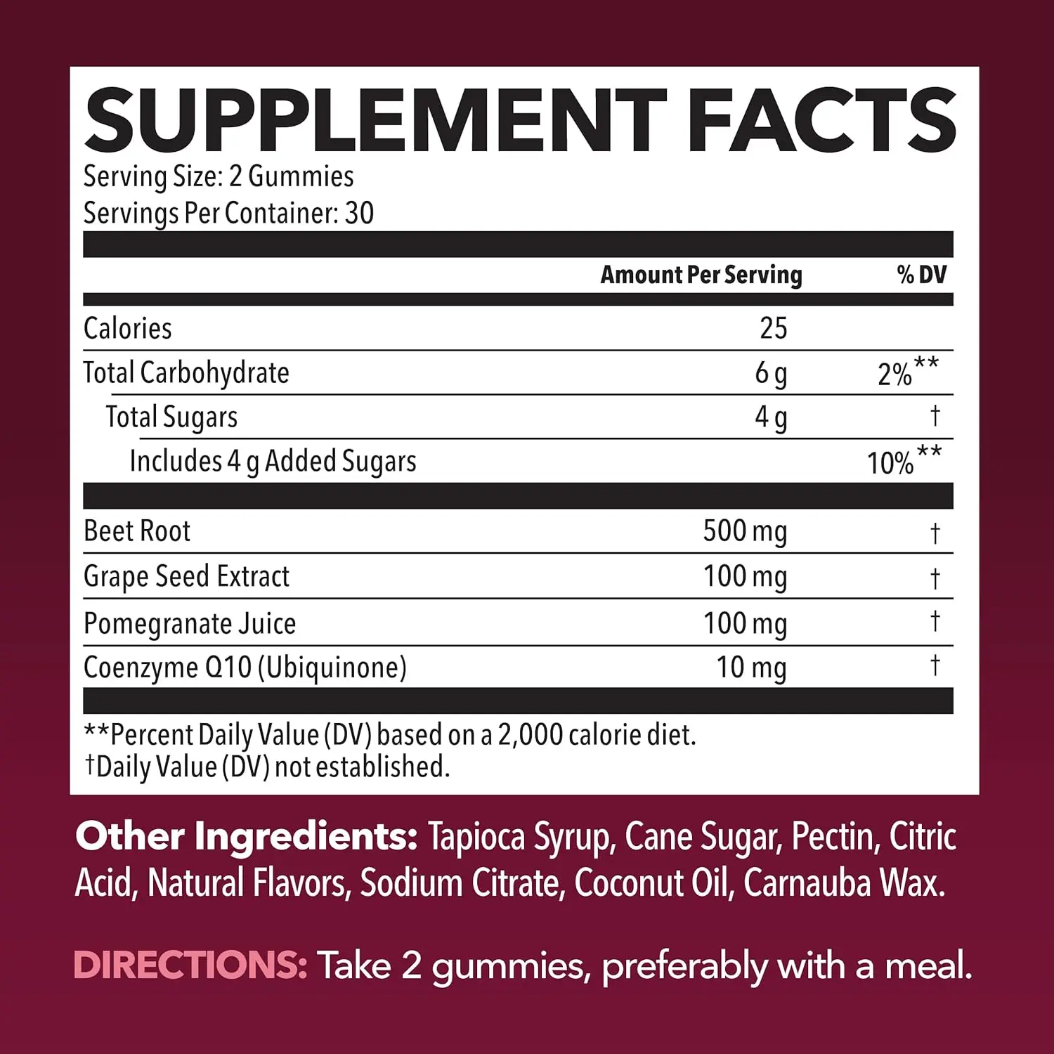 Ingredients: Beet Root Powder, Grape Seed Extract, Pomegranate Juice Powder, Coenzyme Q10 (Ubiquinone), Tapioca Syrup, Cane Sugar, Pectin, Citric Acid, Natural Flavors, Sodium Citrate, Coconut Oil, Carnauba Wax
