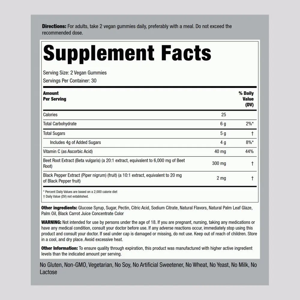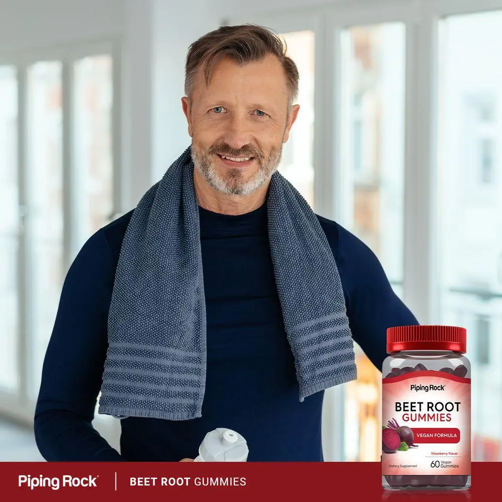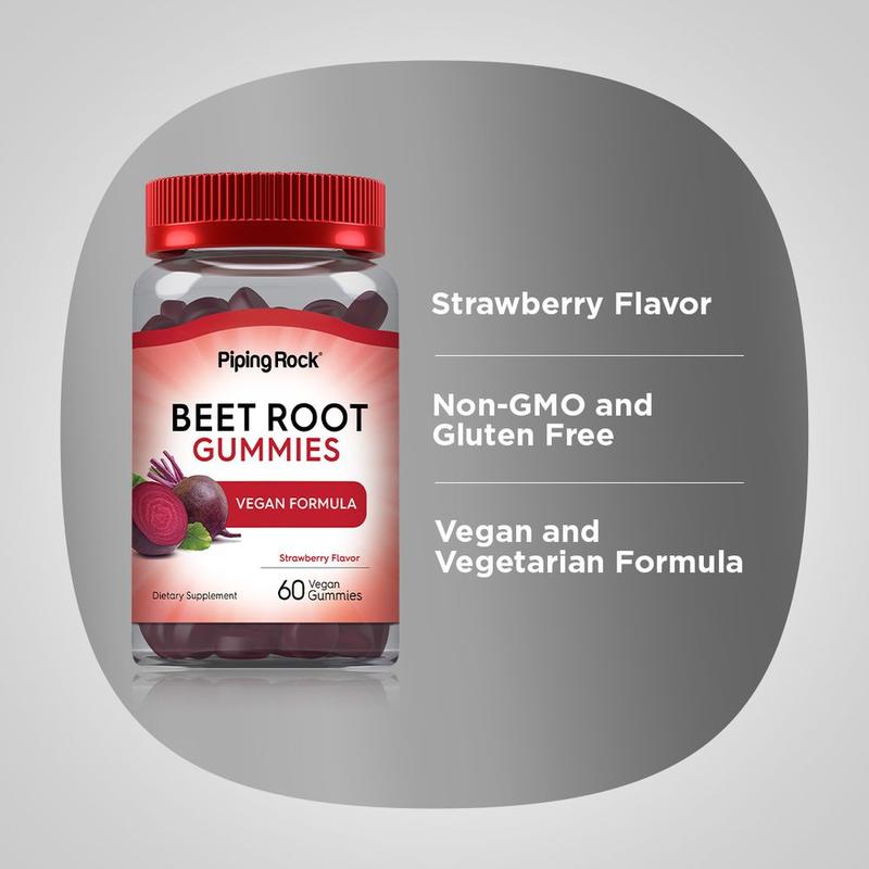 Piping Rock Beet Root Gummies are packed with sweet strawberry flavor. These bite-sized vegan gummy chews feature the equivalent of 6,000 mg of Beet Root per serving, plus Black Pepper Extract and Vitamin C. They provide just what men and women need for a super clean wellness experience.