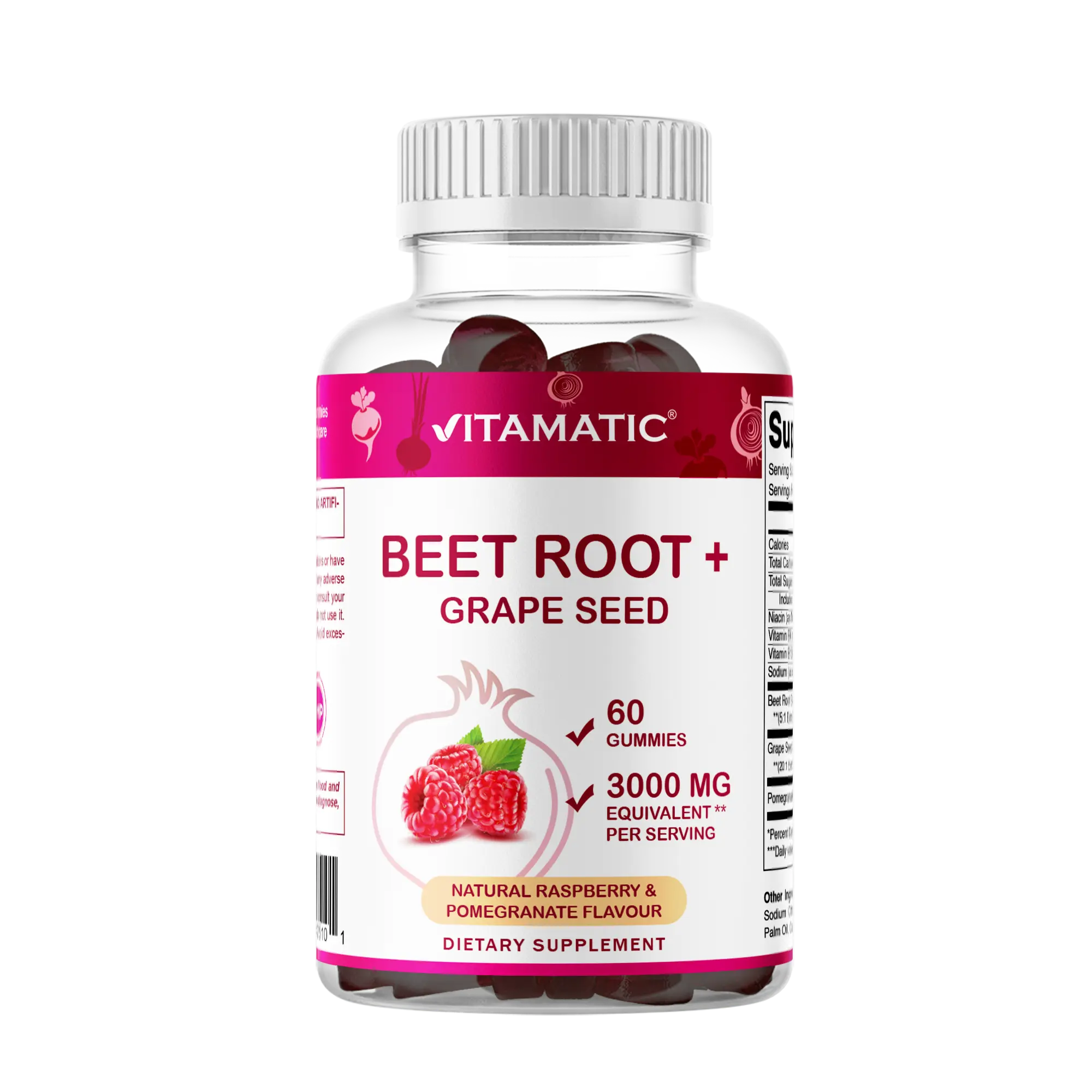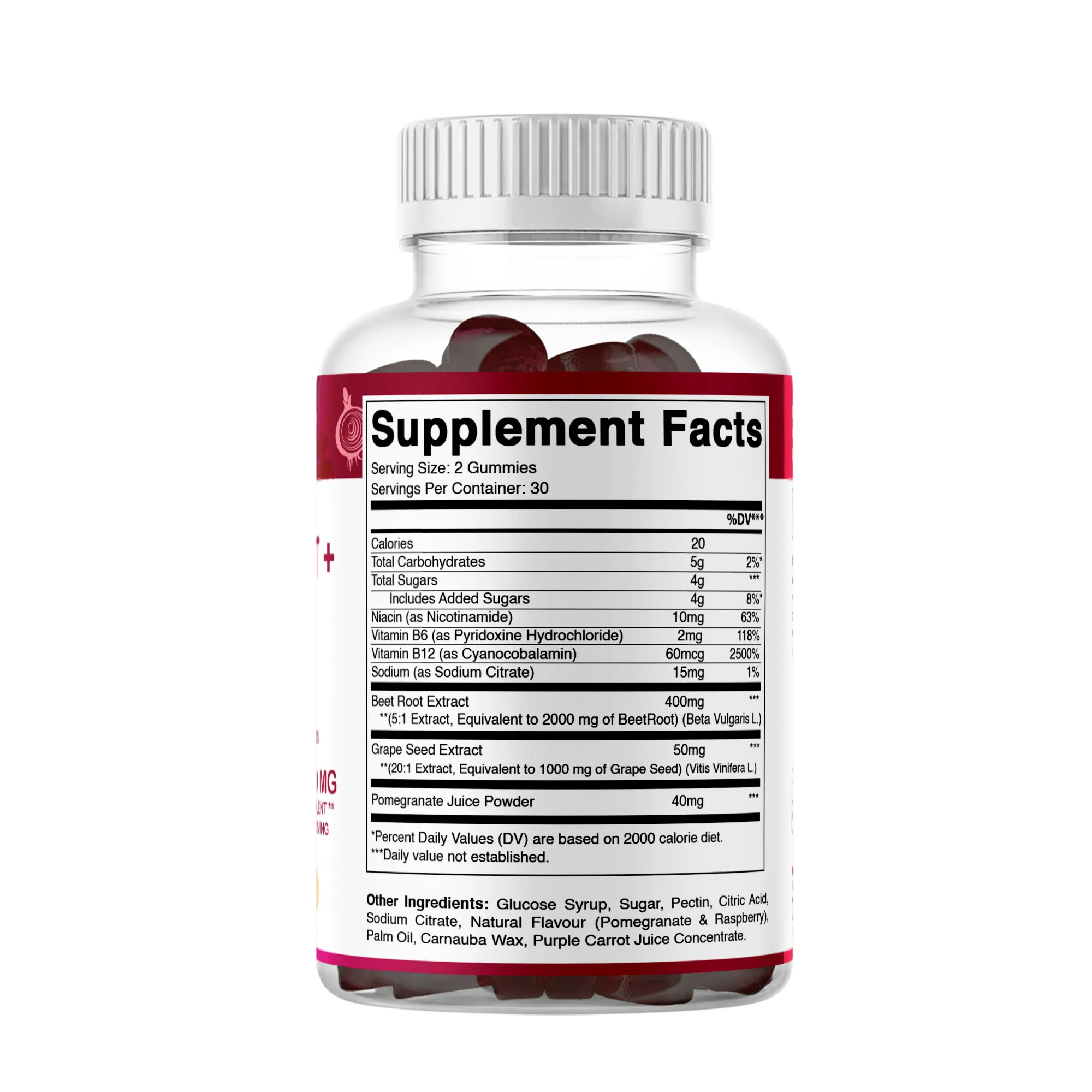 Beet Root Extract, Grape Seed, Pomegranate, Niacin, Vitamin B6, Vitamin B12, Glucose Syrup, Sugar, Pectin, Citric Acid, Sodium Citrate, Natural Flavour (Pomegranate, Raspberry), Palm Oil, Carnauba Wax, Purple Carrot Juice Concentrate.