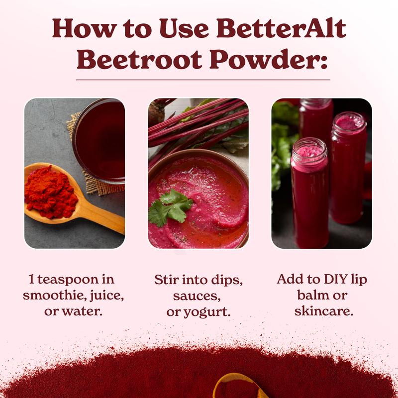 ·Simply mix one scoop of beetroot powder into water, smoothies, or your favorite beverage. Repeat everyday for at least 2-3 months for optimal results.