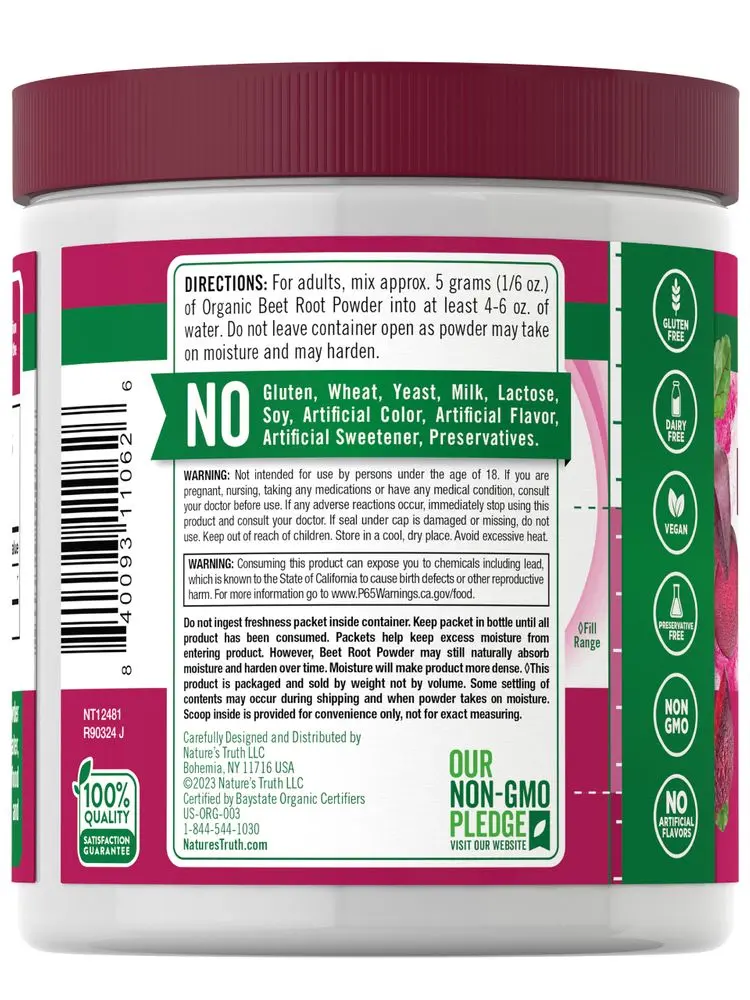 Our mission at Nature’s Truth is to meet your wellness needs with products that go above and beyond. Nature’s Truth provides supplements in various delivery forms, such as capsules, softgels, chewables, tablets, powders, liquids, and gummies to suit every preference. Our Beet Root Powder is vegan, non-GMO, and free of gluten, wheat, yeast, milk, lactose, soy, artificial color, artificial flavor, artificial sweetener, and preservatives.
