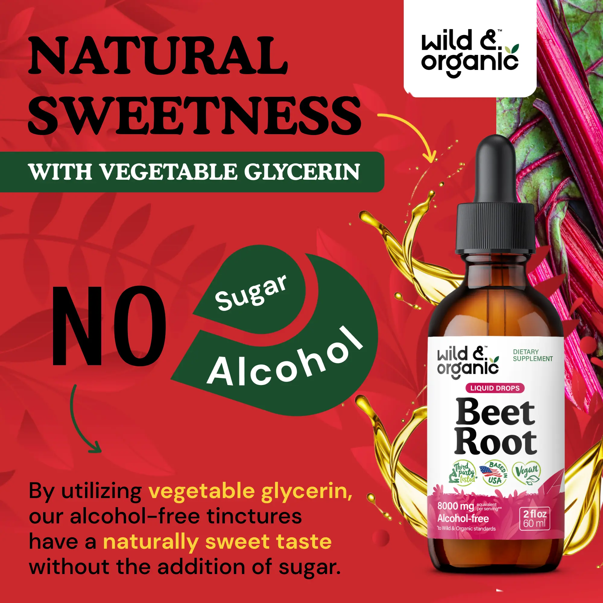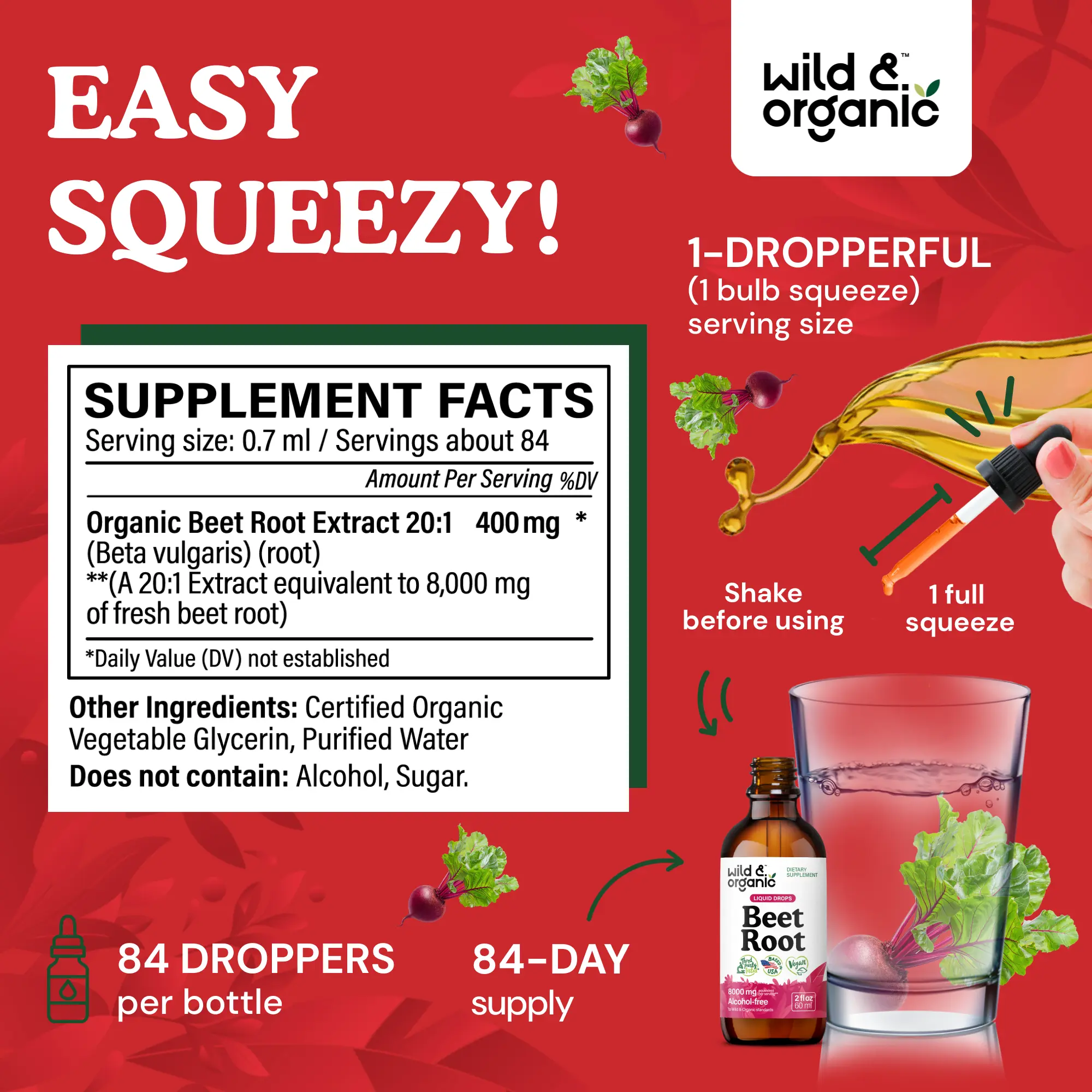Wild & Organic's beet root supplements for men and women are vegetable glycerin-based. This provides an alcohol-free tincture that is easy on digestion. Enjoy a supplement experience without the hassle of alcohol.