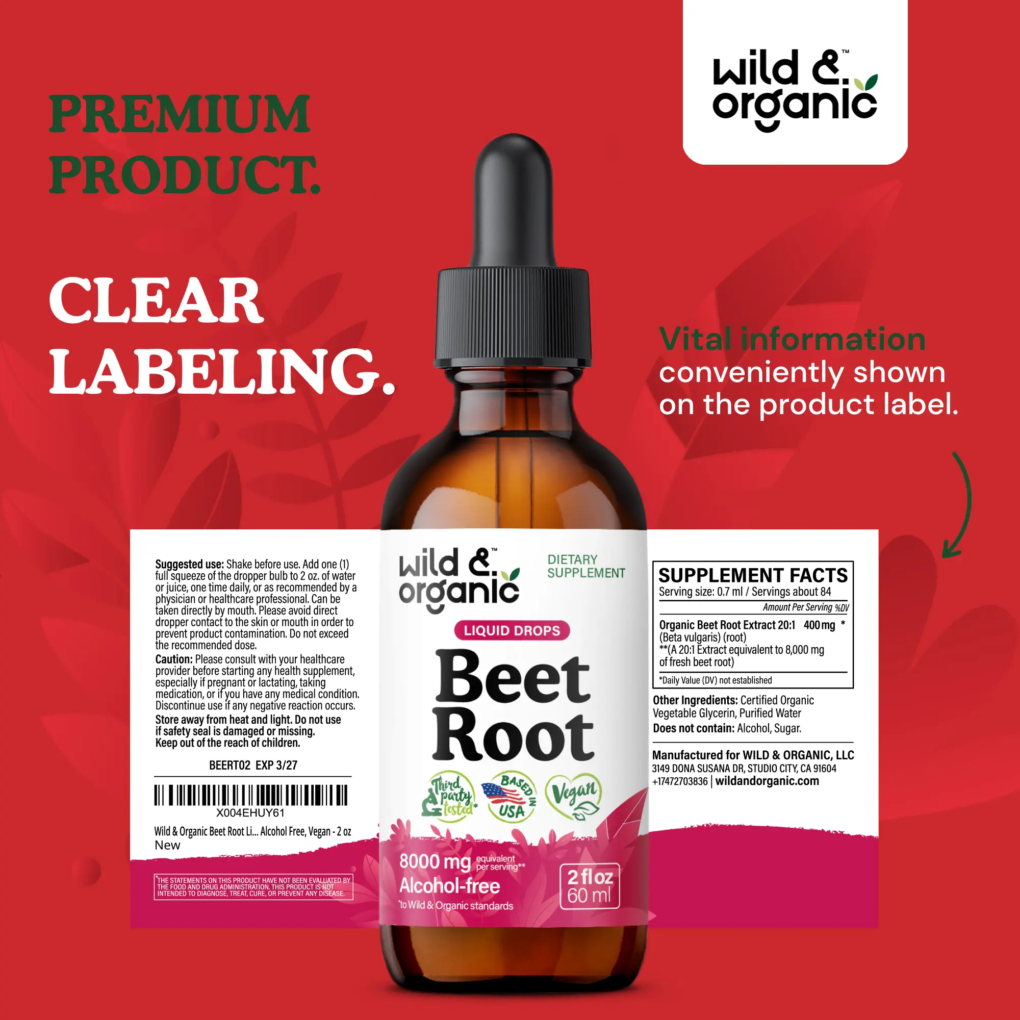Each serving of Wild & Organic's beetroot extract tincture contains 400 mg of beet root extract (equivalent to 8,000 mg of fresh beet root). This provides your overall well-being. Perfect for those seeking a natural support in their daily routine.