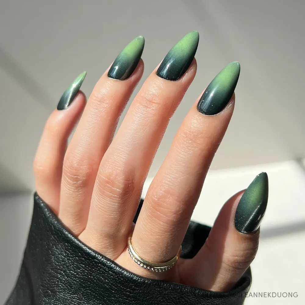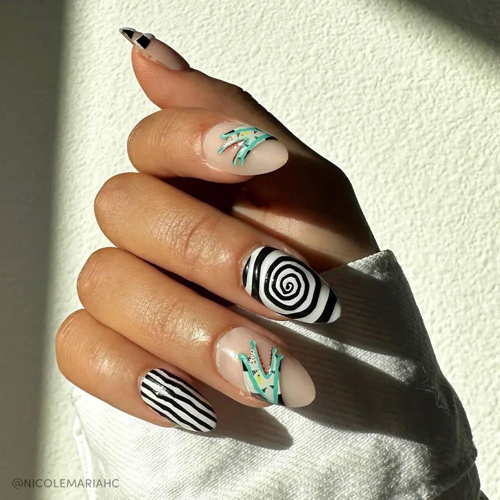Ā·Beetlejuice: Medium almond nails with a striking black-to-green velvet gradient and unique character designs underneath each nail.
