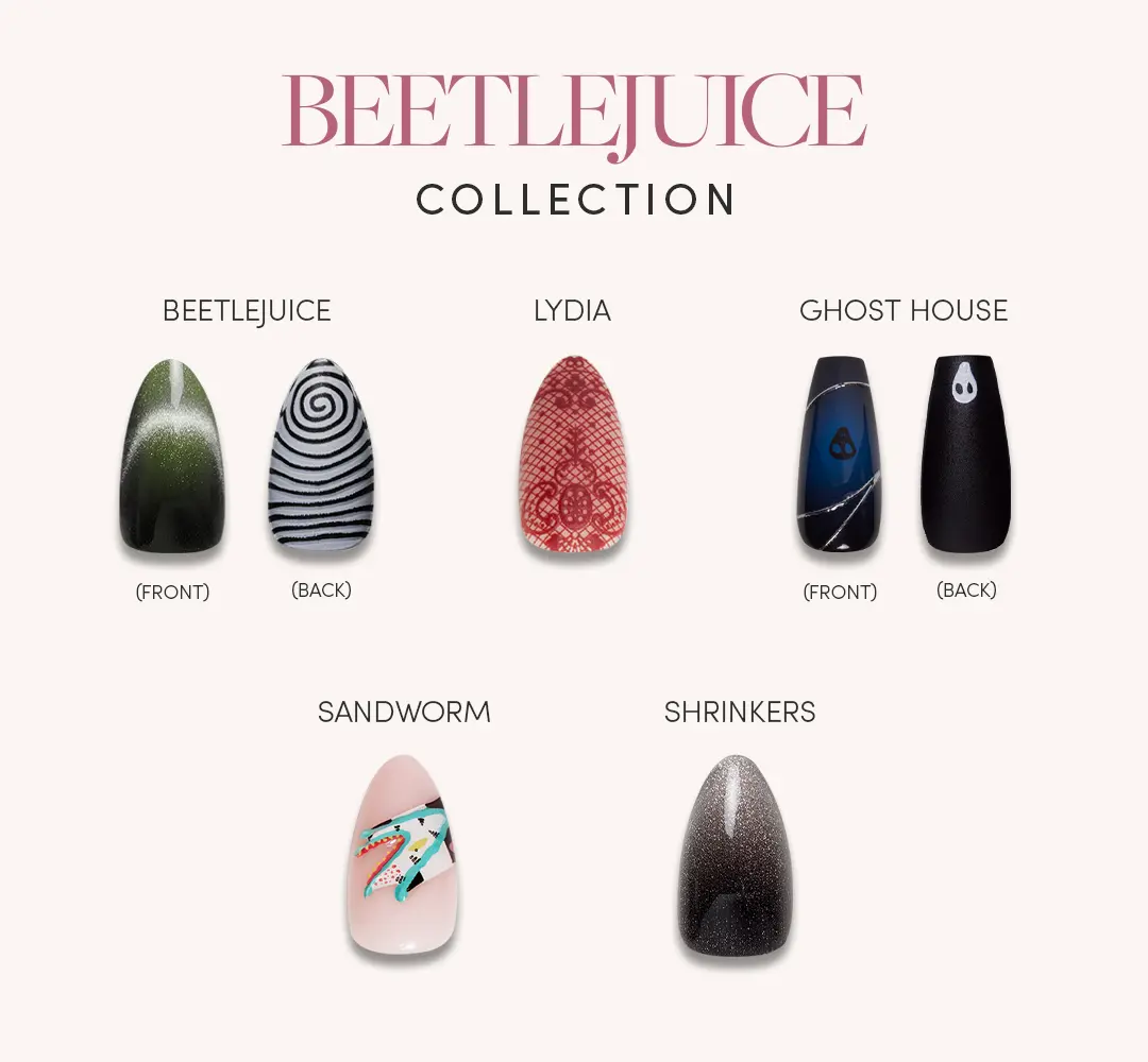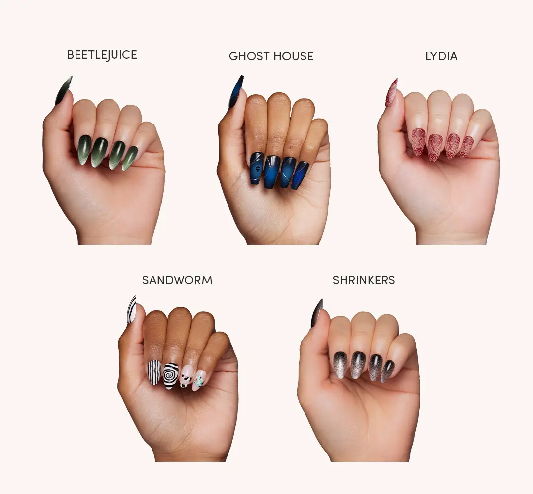 Choose from five hair-raising nail sets, or shop and save with our curated bundles. Each set includes our signature Brush-On Nail Glue, reimagined with a āstrange and unusualā Beetlejuice twist!