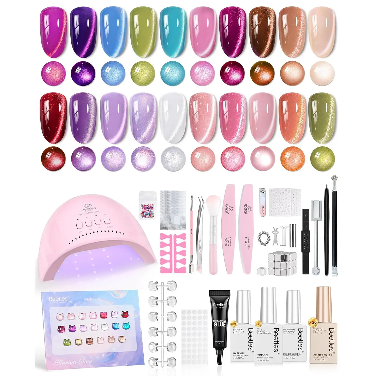 ·Sheer Daylight Gel Polish Kit: This gel nail kit includes 20 colors of 7.5ml cat eye gel nail polish, one 8ml base coat, one 8ml glossy top coat, one 8ml peel off gel base coat, one 5g rhinestone nail glue, 7 kinds of magnet with 2 pcs shaped piece, one nail display board set and other nail tools. Great for girls who enjoy doing manicures at home. They can create nail designs based on seasons, fashion trends, and personal preferences for daily wear, festivals, or special occasions.