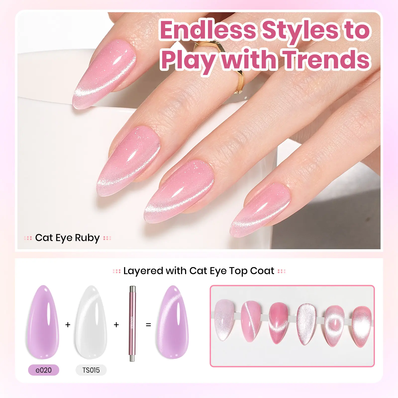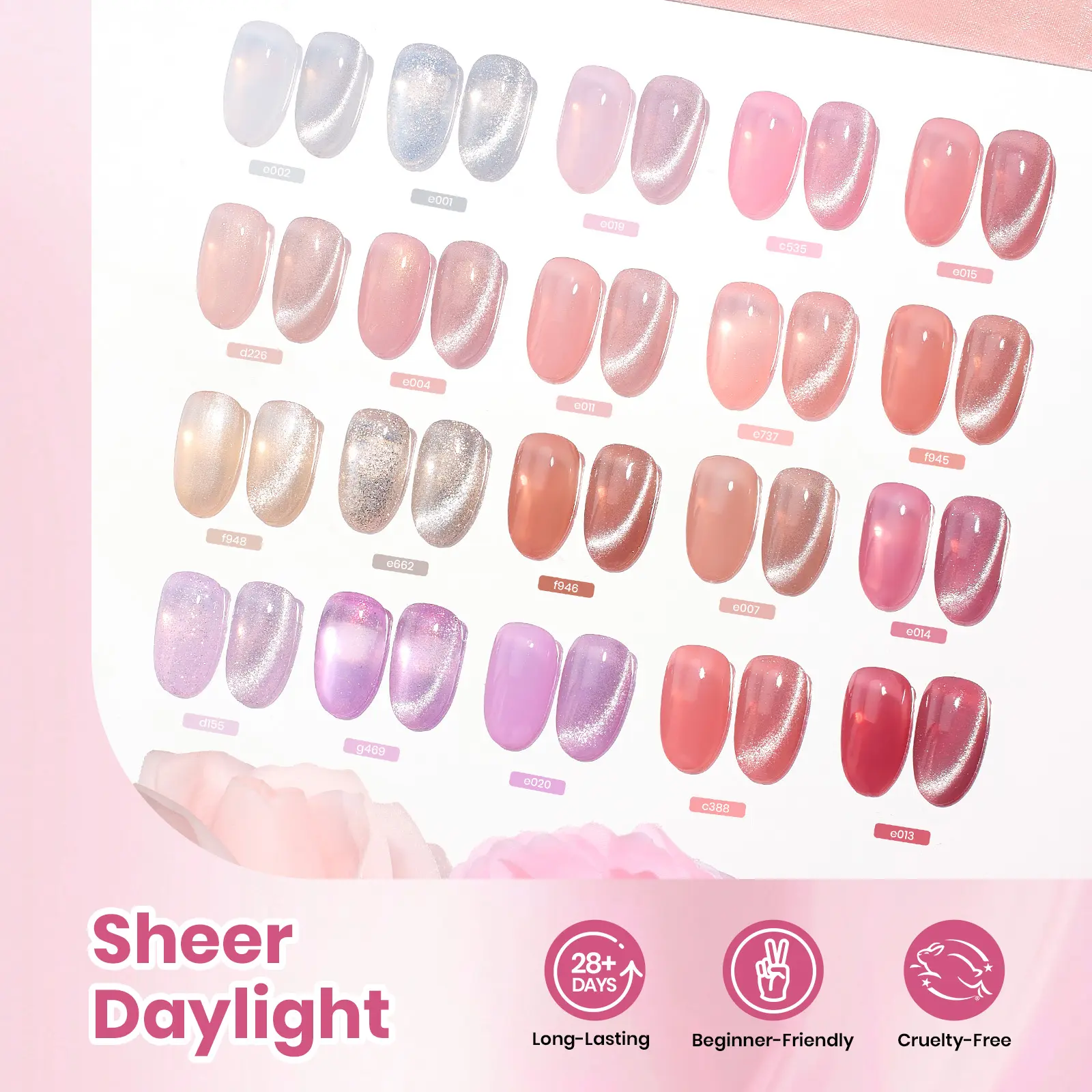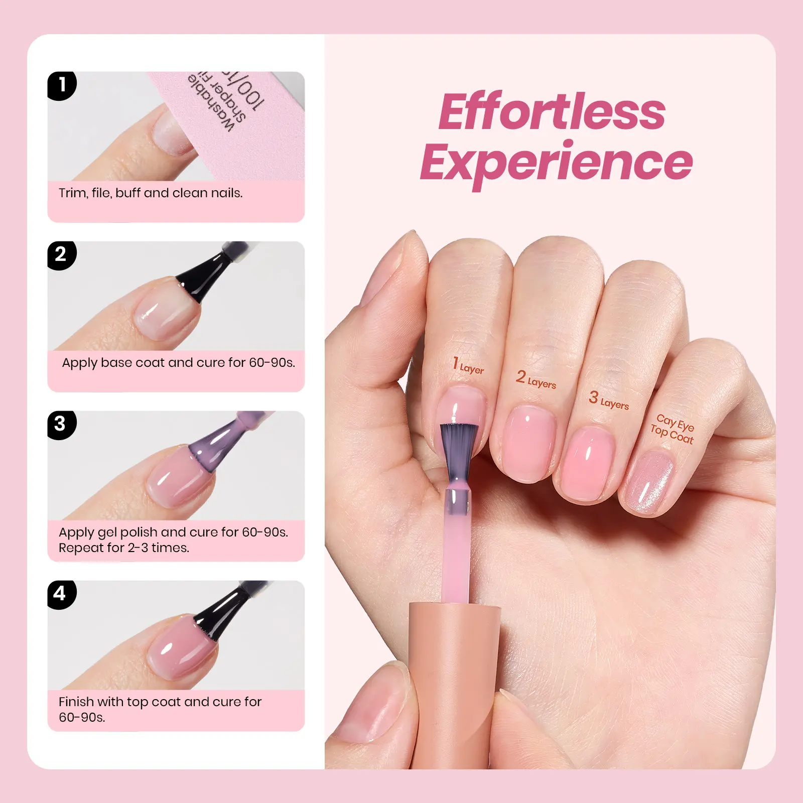 ·Sheer Jelly & Cat Eye Gel Styles: Apply multiple thin layers to gradually build color from a clear, translucent finish to a rich, solid opaque look. One, two, or three coats each create a unique effect, allowing endless customization for every mood and occasion. For even more creative options, layer our cat eye top coat over jelly gel polish to achieve stunning cat eye effects, adding dynamic light reflections for eye-catching, salon-style nail designs at home.