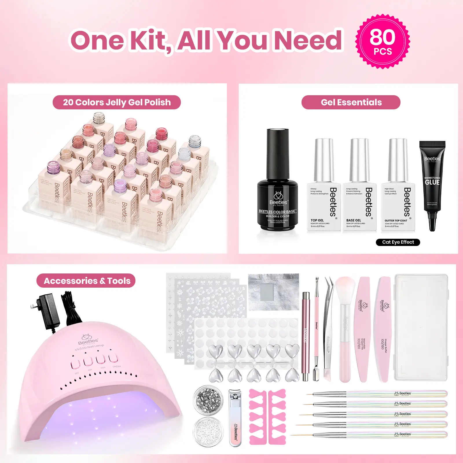 ·Sheer Daylight Gel Polish Kit: This gel nail kit includes 20 colors of 7.5ml jelly gel nail polish, one 8ml base coat, one 8ml glossy top coat, one 8ml cat eye top coat, one 15ml rubber base, one 5g rhinestone nail glue, one magnet, one nail display board set, and other nail tools. It is great for DIY beginners and girls who enjoy doing manicures at home. They can create nail designs based on seasons, fashion trends, and personal preferences for daily wear, festivals, or special occasions.