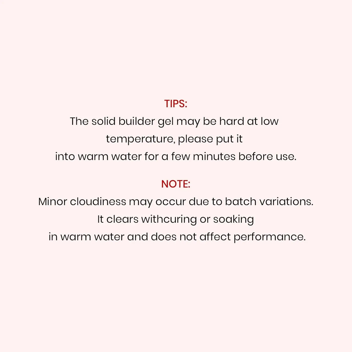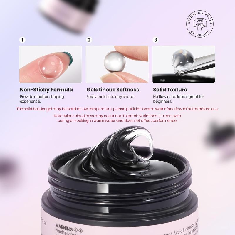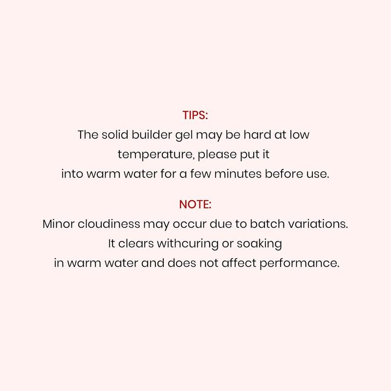 ·Warning: The solid builder gel may be hard at low temperature, please put it into warm water for a few minutes before use. And please keep the hard gel for nails in a cool place when the weather is hot. Base and top coat required, cure under UV/LED nail dryer lamp. Any problems, please feel free to contact us.