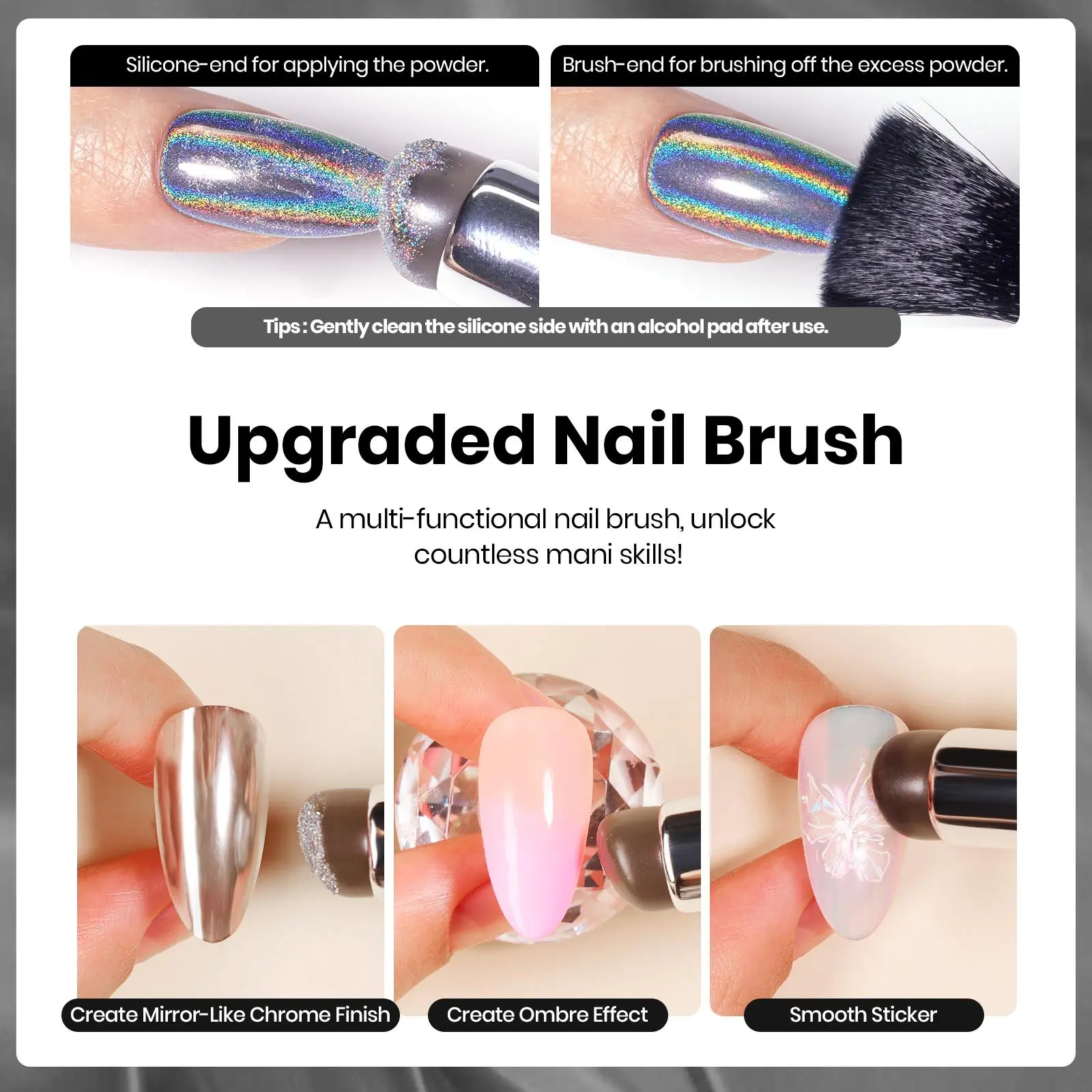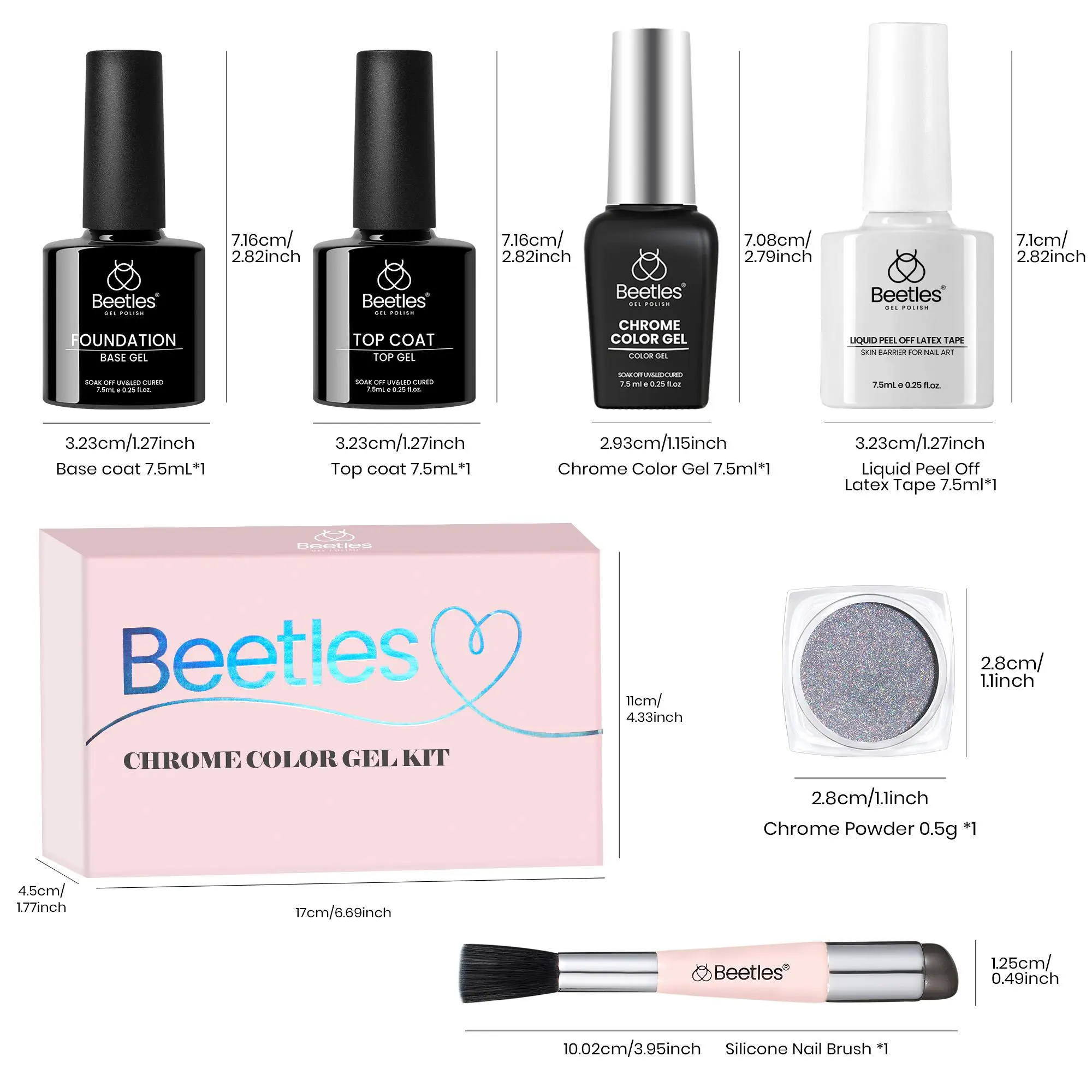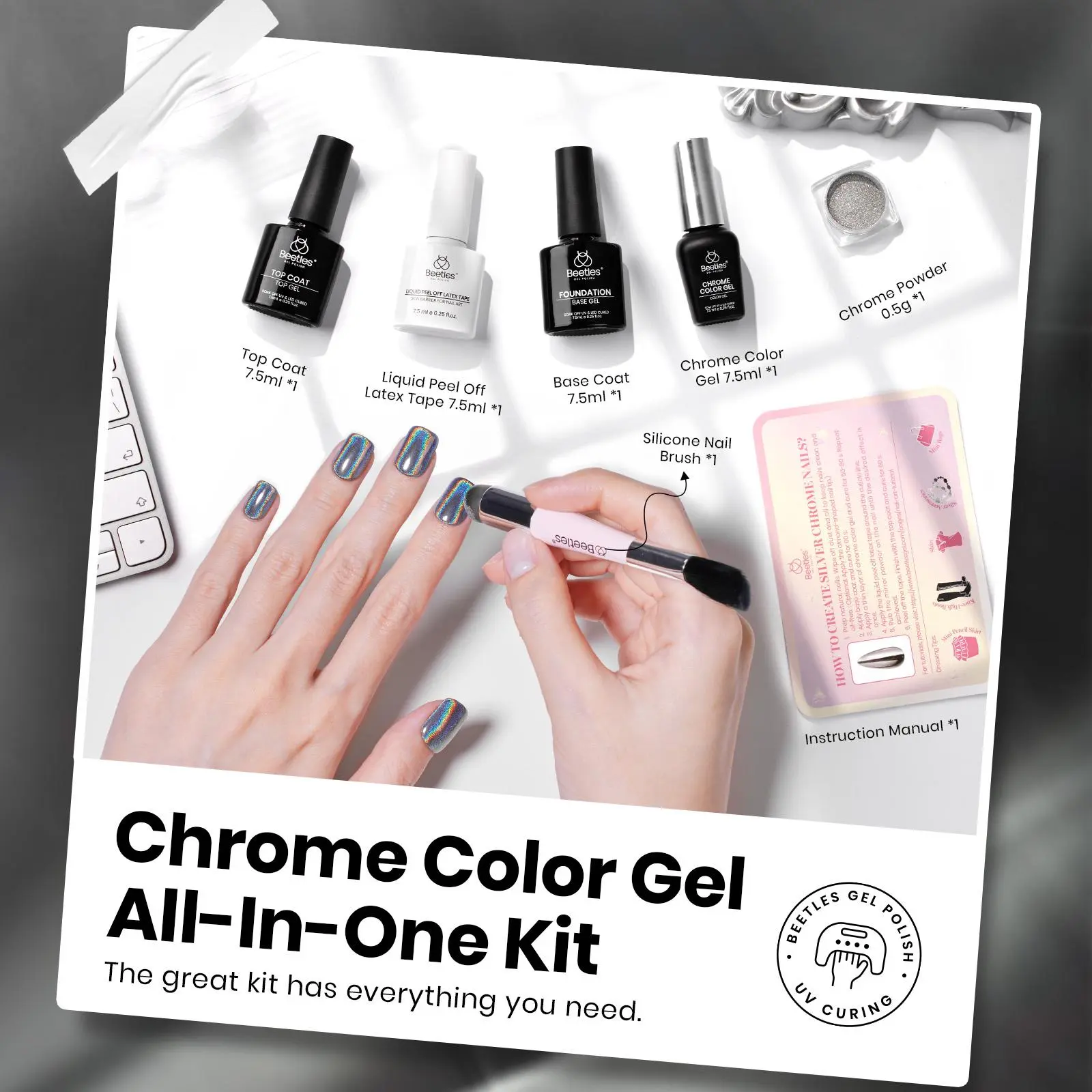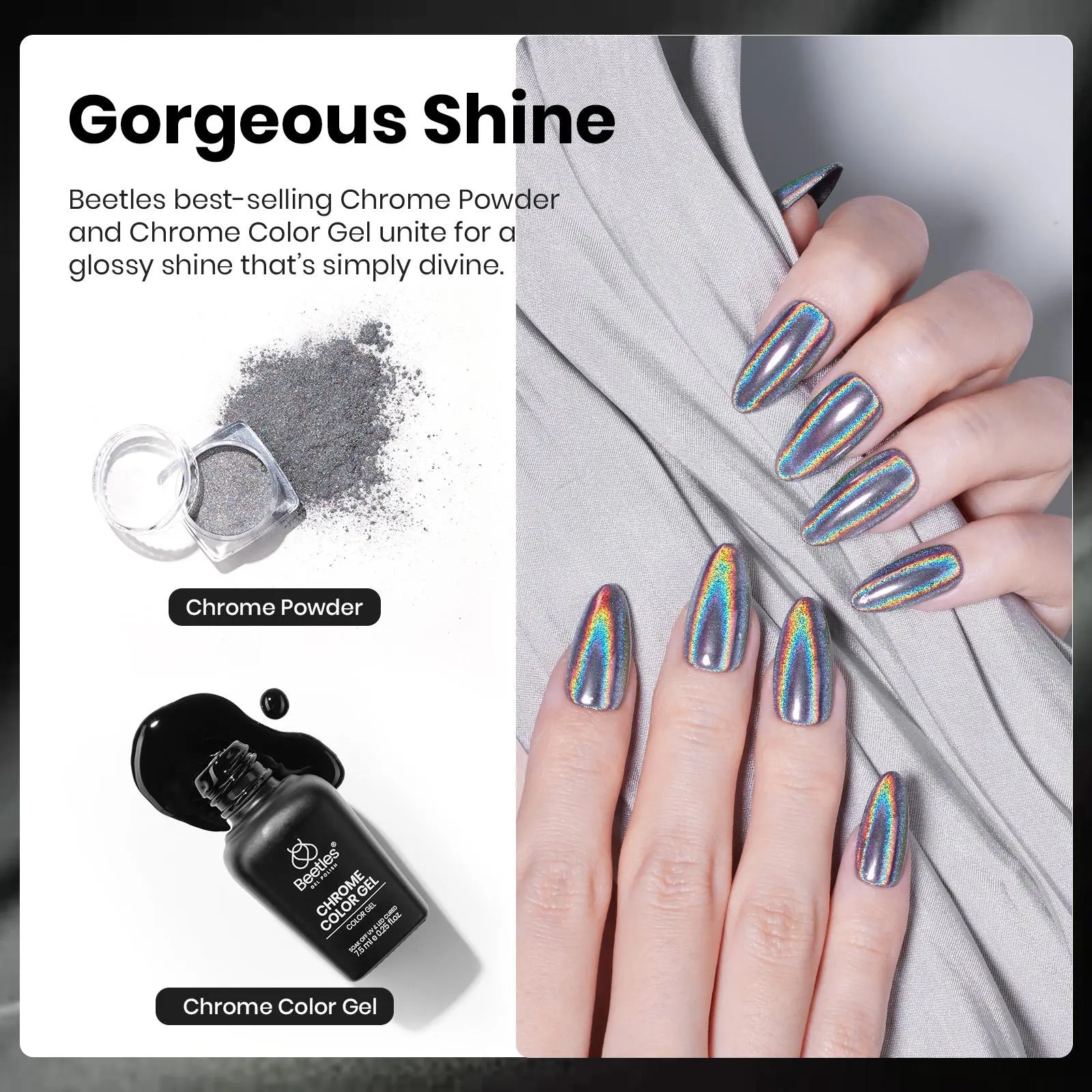 4. Beetles All-In-One Chrome Nail Powder Kit, Silver Holographic Chrome Nail Powder with 7.5ML Black Color Gel Nail Polish, Base & Top Coat, Peel-Off Latex Tape & Silicone Nail Brush, Chrome Nail Set for DIY Nail Art, Perfect Gift for Women