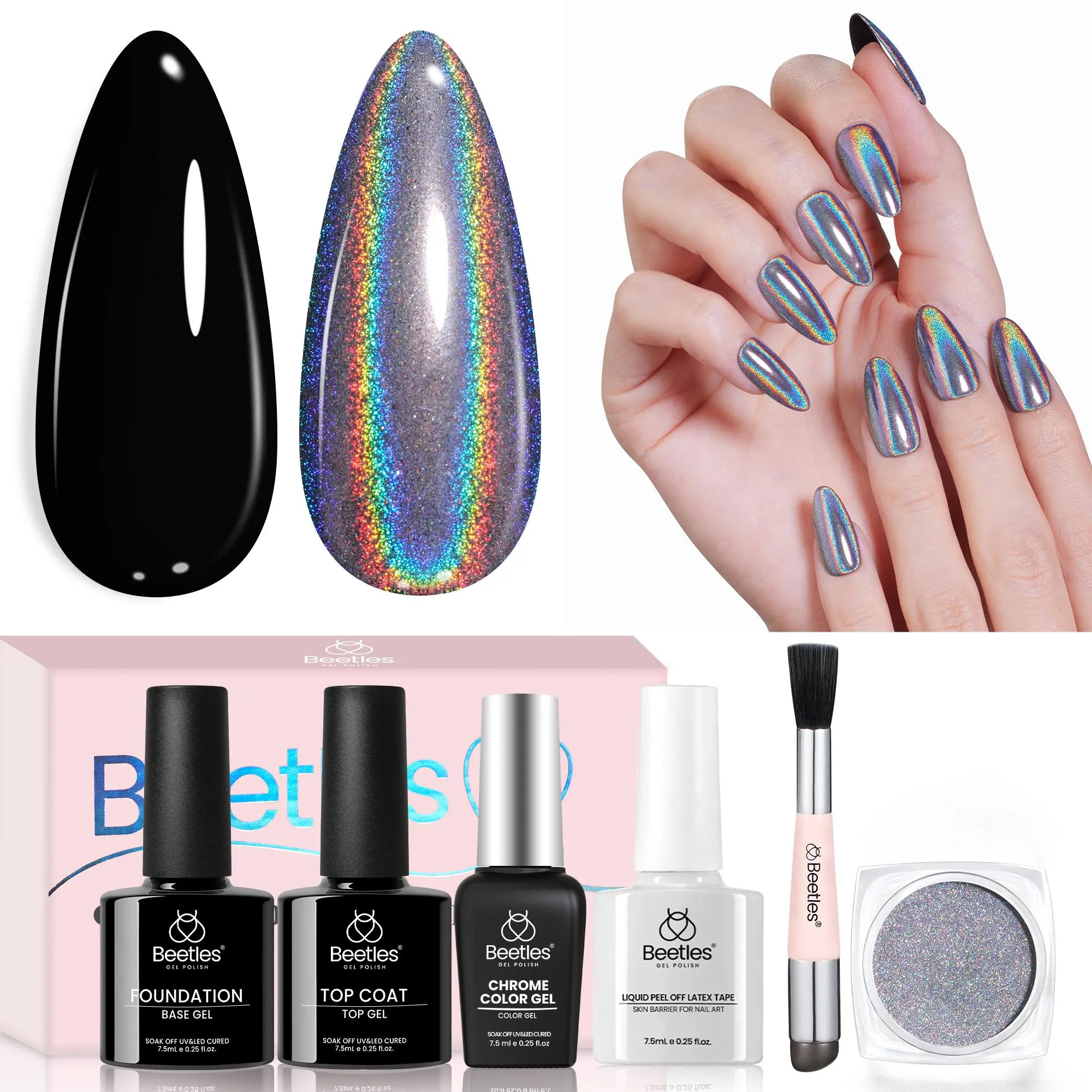 Beetles All-In-One Chrome Nail Powder Kit, Silver Holographic Chrome Nail Powder with 7.5ML Black Color Gel Nail Polish, Base & Top Coat, Peel-Off Latex Tape & Silicone Nail Brush, Chrome Nail Set for DIY Nail Art, Perfect Gift for Women