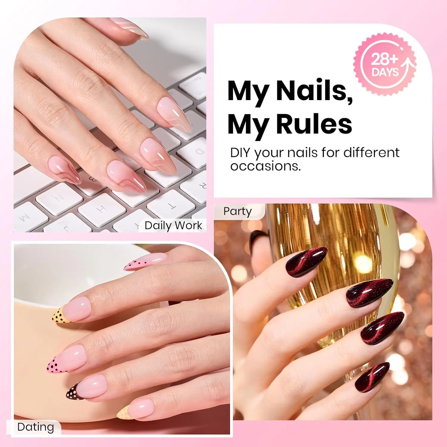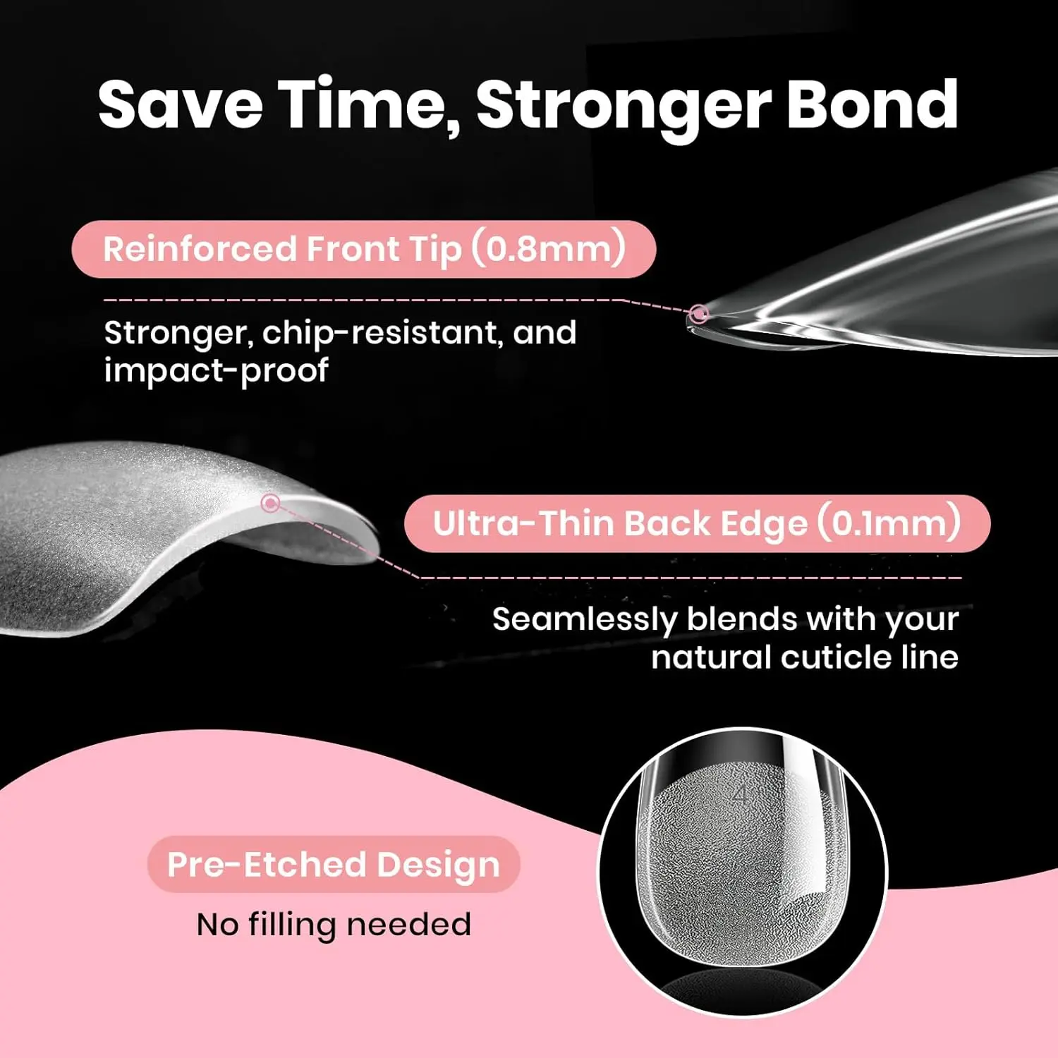 ·Long Lasting 28 days+: Upgraded pre-etched curved nail tips eliminate the need for shaping and filing, reducing polishing time and increasing the contact area between glue and tips for improved adhesion. The thin back edge seamlessly adheres to your natural nail, extending your nails in just 3 minutes and showing them off for over 4 weeks