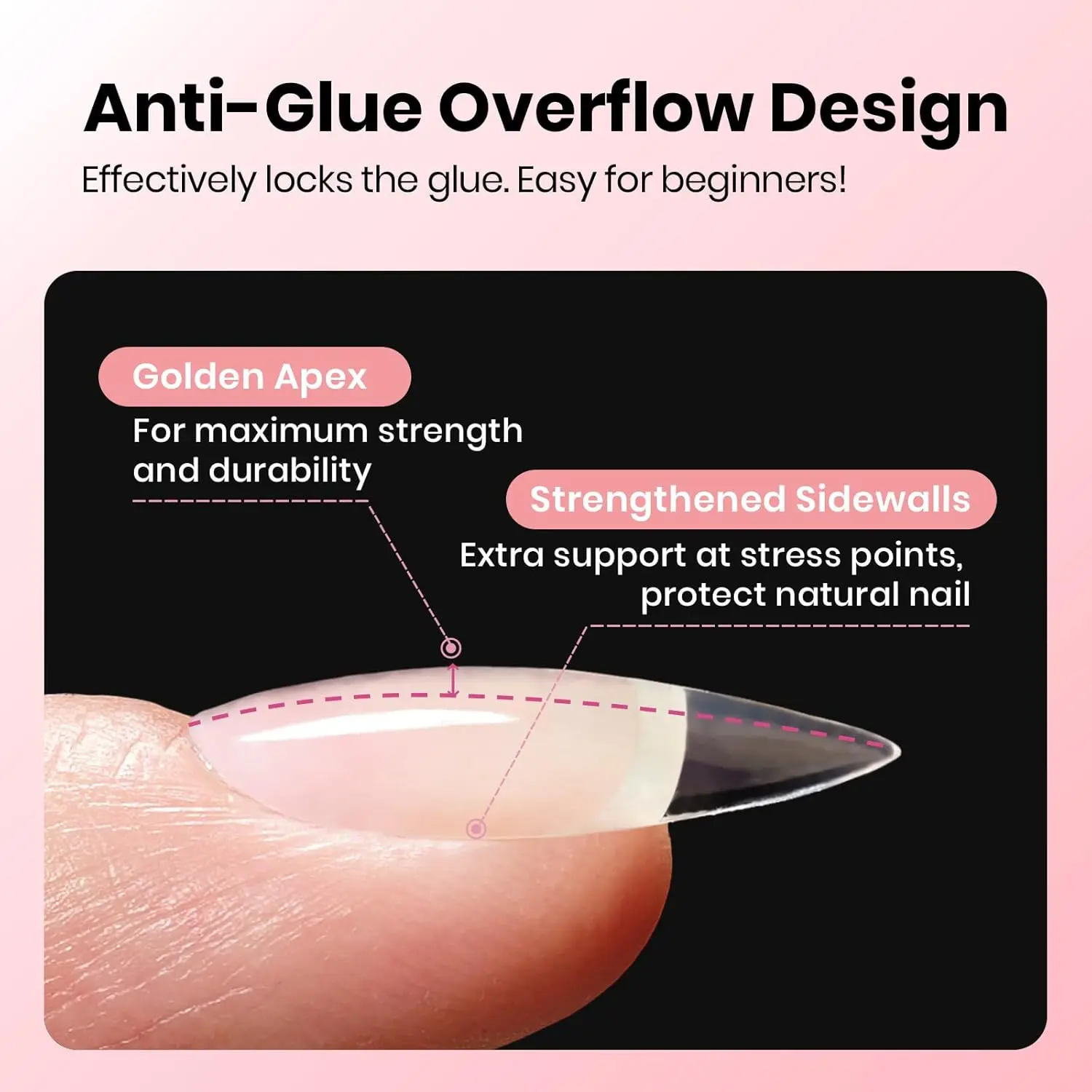 ·Beginner-friendly Design: Featuring a golden ratio of apex and anti-overflow glue structure, engineered for strength and a clean application. This design prevents breakage and controls glue overflow, making it easy for anyone—from beginners to professionals—to achieve a salon-quality finish. (Warm reminder: this set does not include nail glue)